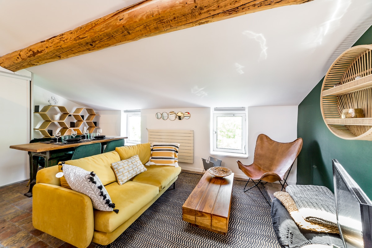 Auténtico canut de 250 años, corazón Croix-Rousse, acogedor y tranquilo. Sumérgete en la historia de un edificio liones del siglo XVIII. Este canut con piedras a la vista y techo liones ofrece un ambiente cálido, bañado de luz hacia el sur. La sala de estar reúne un salón, una cocina equipada y una zona de oficina dedicada con wifi de fibra rápida, ideal para teletrabajo o seminarios. A 1 minuto del metro, está rodeado de mercados, bares y tiendas, mientras disfruta de una calma absoluta por la noche.
