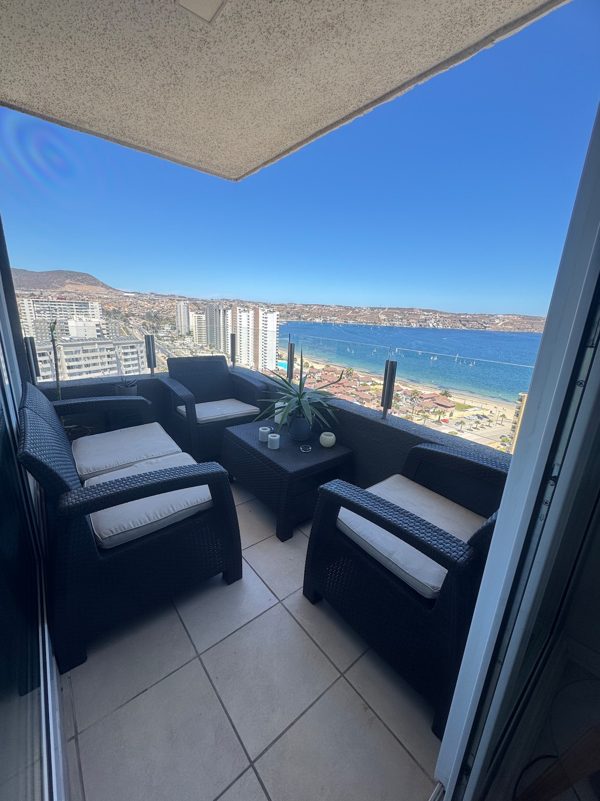 Descansa frente al mar en La Herradura Te invitamos a disfrutar de una estadía única en un departamento en primera línea de playa, con una vista privilegiada a la bahía y una atmósfera pensada para el relajo y la desconexión. El espacio ha sido decorado con detalles cálidos, materiales naturales y un estilo costero que te hará sentir como en casa desde el primer momento. Ideal para escapadas en pareja, descanso familiar o simplemente darte un respiro frente al mar.