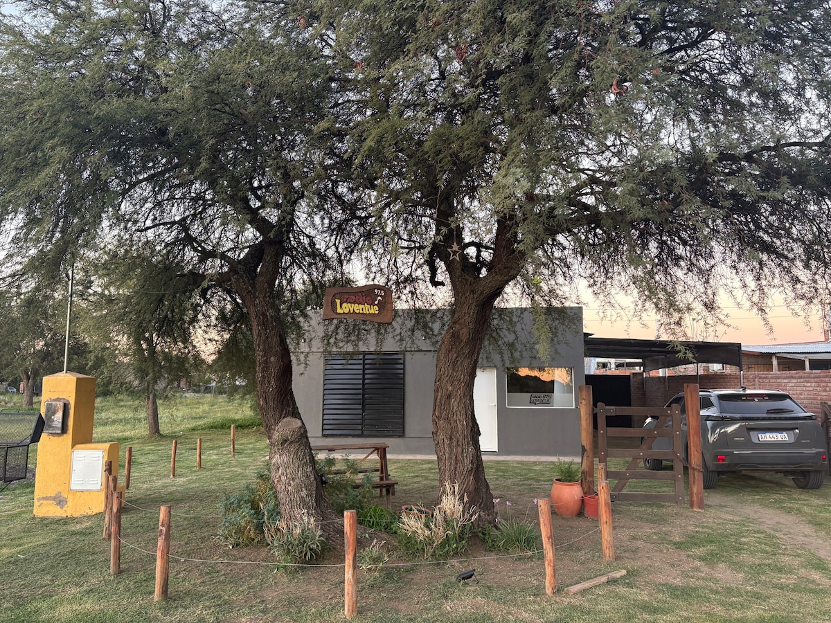 Casa de campo moderna y confortable en una hectárea de campo con vistas excepcionales a los bosques de calden. Situada a sólo 15 minutos de Santa Rosa y a 5 del autódromo, es ideal para un fin de semana de relax o para hacer etapa en el camino hacia el sur. Seguridad y tranquilidad totales. Dispone de una cama doble, una cama marinera y un sofá cama doble. Cocina moderna totalmente equipada y parrilla cubierta. Dos ambientes muy espaciosos con AC. Diseño bioclimático y Internet starlink.