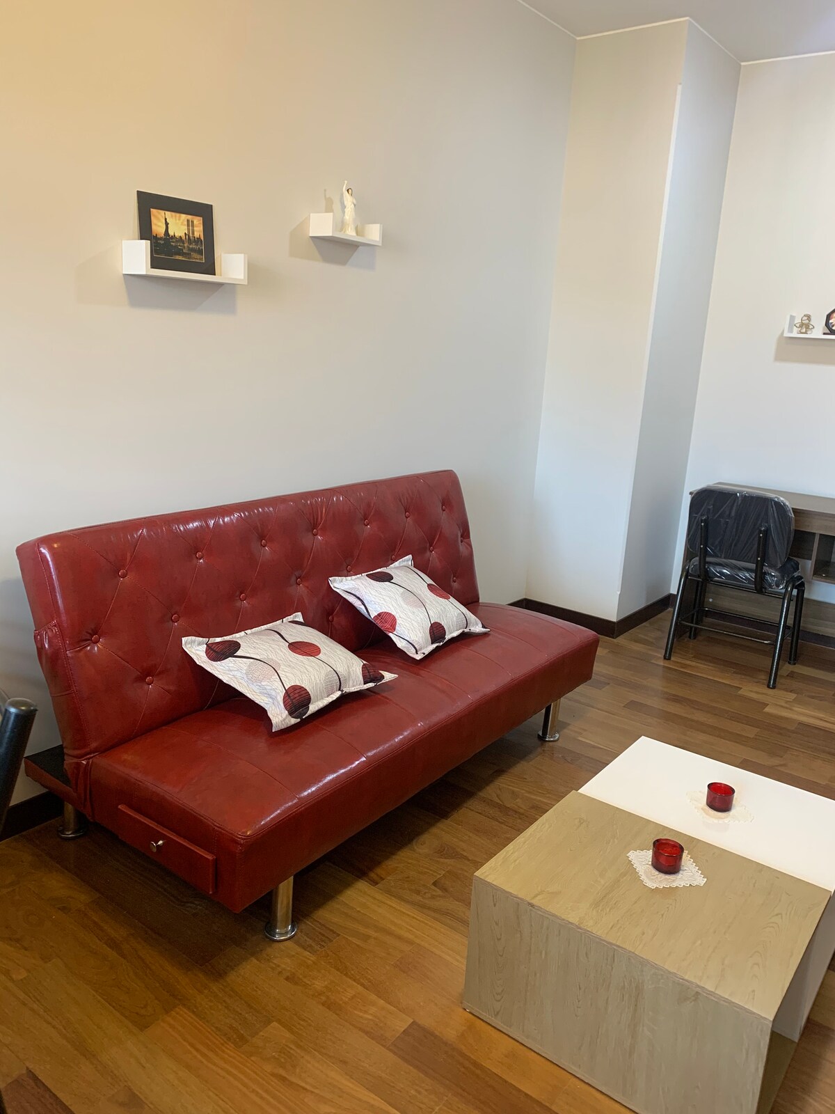 El departamento es encantador! La habitación cuenta con material de línea hotelera para un descanso confortable, la cocina y sala cuentan con todas las comodidades necesarias. La iluminación es perfecta! El departamento se encuentra en una zona completamente segura y centrica, a pasos de supermercados, embajadas, hospitales, bancos, cine, estaciones de teleférico, cafeterías, centros comerciales, bares de rock, discotecas, etc.