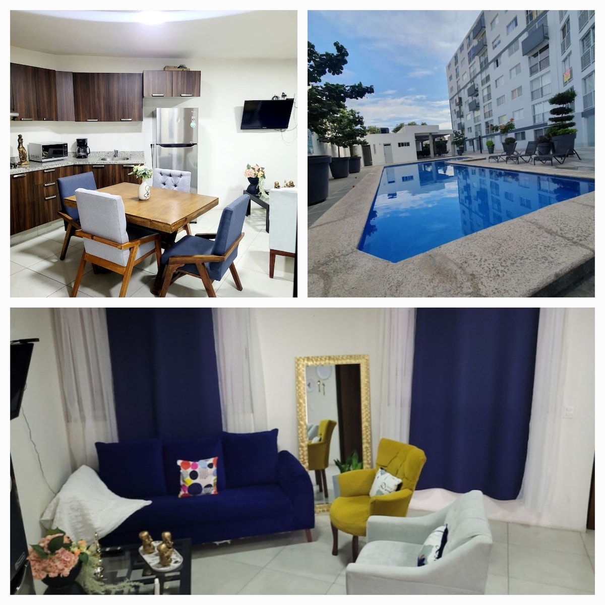 Lujoso y bonito apartamento con diseño art déco y muebles, relájate y disfruta de la vista porque está en un noveno piso, cuenta con comodidades como una pintoresca piscina, gimnasio, azotea panorámica, sala social, parrillas de barbacoa, seguridad y ascensores. El apartamento tiene una habitación con cama tamaño queen, un baño completo, lavandería, cocina completa, nevera con máquina de hielo y dispensador de agua fría. Ofrecemos 2 toallas para la ducha y 2 toallas para la alberca. También ofrecemos tours a la ciudad y pueblos mágicos.
