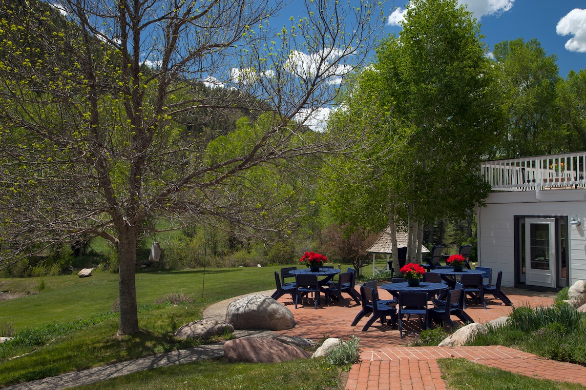 En el estilo clásico de Colorado, esta habitación de invitados Carriage House en la planta baja tiene una cama con la parte superior acolchada tamaño king y un juego de literas que se adaptarán a una familia de cuatro o a un grupo de amigos. Hay una estufa de gas para calentar los pies e incluso un aire acondicionado sin conductos para refrescarse después de nuestros días de verano. Algunas de las comodidades que encontrarás en Elk Creek son Wi-Fi de cortesía, un televisor de pantalla plana con DIRECTV, una estación de estacionamiento para iPod, guías de campo y, por supuesto, nuestras cómodas batas de hormiga en Creek. También hay una cafetera Keurig y tu nevera está equipada con aguas, refrescos y jugos de cortesía.