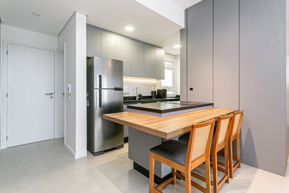 Increíble apartamento de alto nivel con 2 dormitorios con suite, balcón gourmet con parrilla de carbón y cocina americana. Piscina en la terraza exterior. Tus mascotas son bienvenidas, siempre y cuando estén entrenadas y no puedan estar solas en el apartamento, porque si ladran y molestan a los vecinos, el condominio aplica una multa que se pasará al huésped de Airbnb.