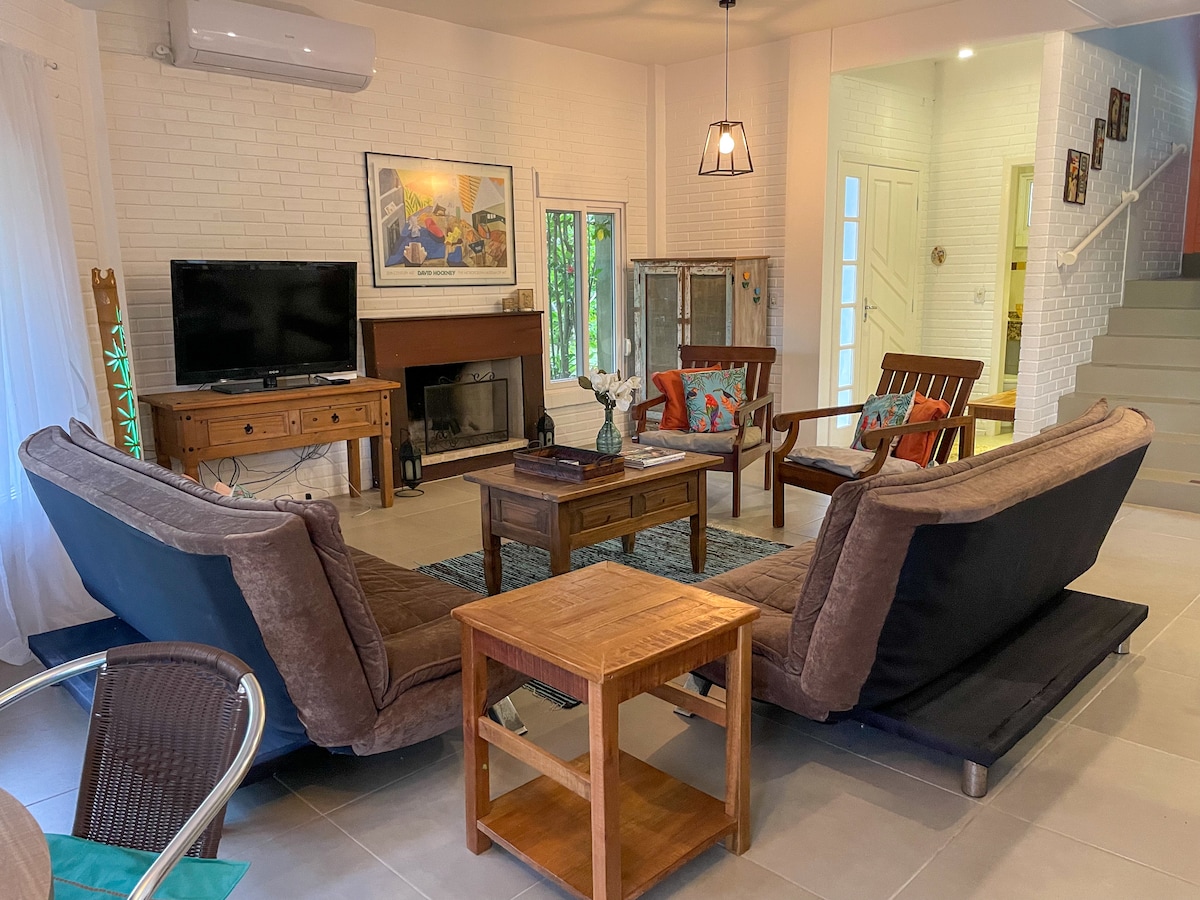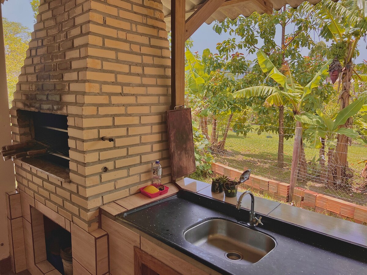 Relájese con toda la familia en este alojamiento tranquilo. Ambiente de la casa todo cercado con patio muy espacioso con parque para que los niños se diviertan además de mesa de ping-pong y portón electrónico. Alrededor de la casa y a disposición de los visitantes hay un estanque con peces, quiosco y barbacoa, huerta, varias aves para interactuar. Se permite la pesca de caña. Varias atracciones en los alrededores como cascada, piedra para rápel, salto de ultraligero, además de pista de motocross a menos de 1 km de la casa.