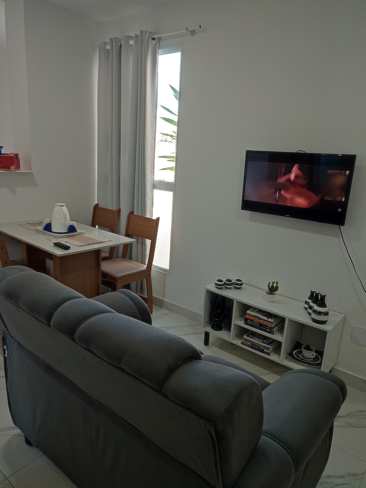 Abraza la sencillez en este lugar tranquilo y bien ubicado. Piso con aire acondicionado, microondas, cafetera, minibar, TV inteligente, Wi-Fi, platos, vasos y cubiertos. Edificio con plaza de aparcamiento, conserjería con horario de funcionamiento diario de 8h a 20h, zona común para comidas y lavandería paga en el lugar. Ubicación privilegiada, cerca de supermercado, panadería, farmacia, restaurante, gimnasio y estación de autobuses.