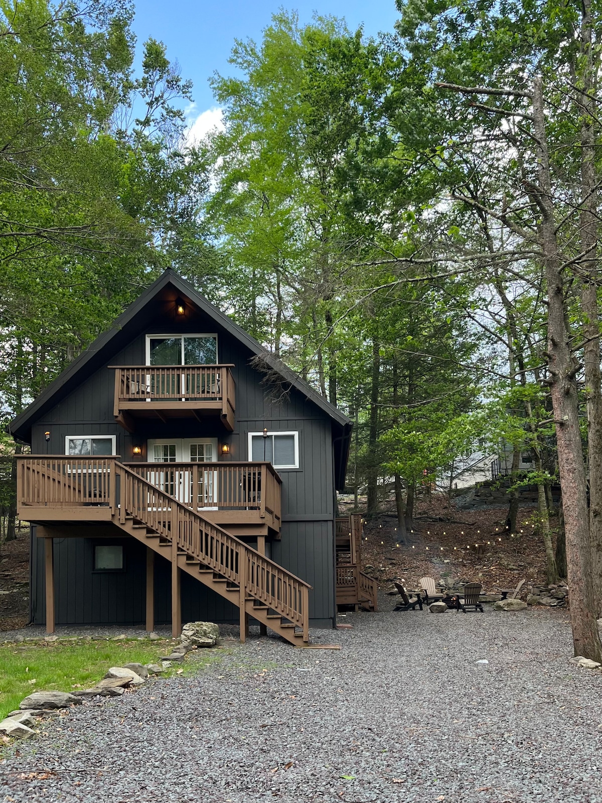 Bienvenido a Skylight Chalet: escápate a nuestra serena cabaña con estructura en A ubicada en los tranquilos bosques de las montañas Pocono. Situado en casi un acre de exuberante bosque y rocas, nuestro refugio ofrece un equilibrio perfecto entre comodidad, calidez y relajación. Relájate en el jacuzzi bajo las estrellas, rejuvenece en la sauna o reúnete alrededor de la hoguera para pasar noches acogedoras con amigos y familiares. Ya sea que busques aventura o relajación tranquila, nuestra cabaña ofrece un santuario sereno para tu escapada.