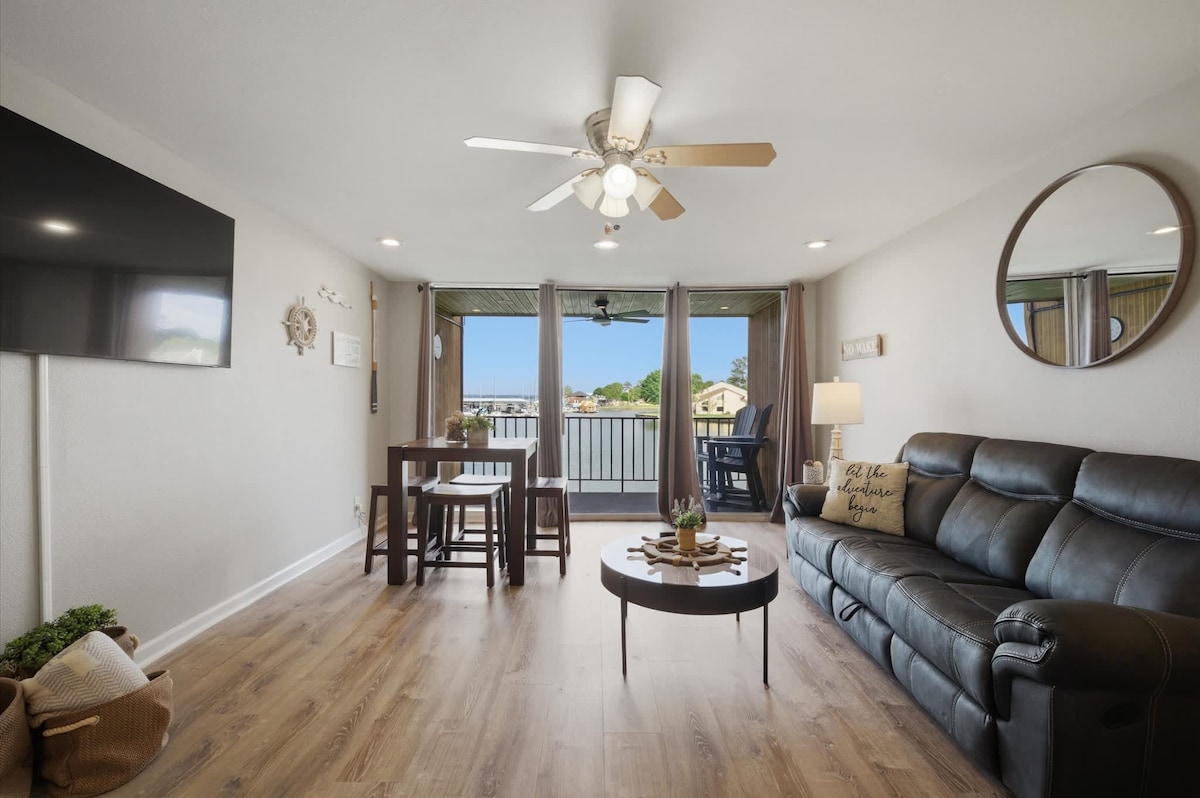 ¡La diversión para toda la familia te espera en esta elegante casa de 2 dormitorios en el agua! El ascensor te ofrece acceso directo a la vista del tercer piso del puerto deportivo y del lago de 21 000 acres. Esta unidad de planta superior con techos altos abovedados, una planta abierta y vistas impresionantes debería hacer que tu estancia sea muy especial. El Yacht Club, que ofrece buena comida en el lago, está a 2 minutos a pie. Está justo al lado de la gran piscina, que se encuentra entre el club náutico y el bar deportivo Breakwater Grill.