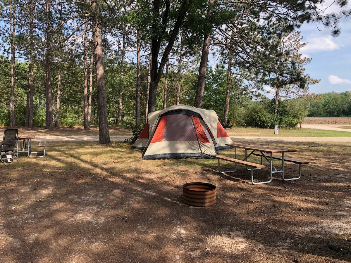 *MOVING LOCATIONS!!! WILL NOW BE LOCATED ON THE MENOMINEE RIVER NEAR SHAKEY LAKES** Equipped with a queen mattress, blankets pillows and various furniture. Comes with a set of camping dishes (pots, kettle, plates, cups, silverware, and french press) Outdoor shower Porta potty Lantern Fire pit with grill grate Outdoor furniture Fan Each site has privacy from other sites, but it is a campground so you could see other guests at times.