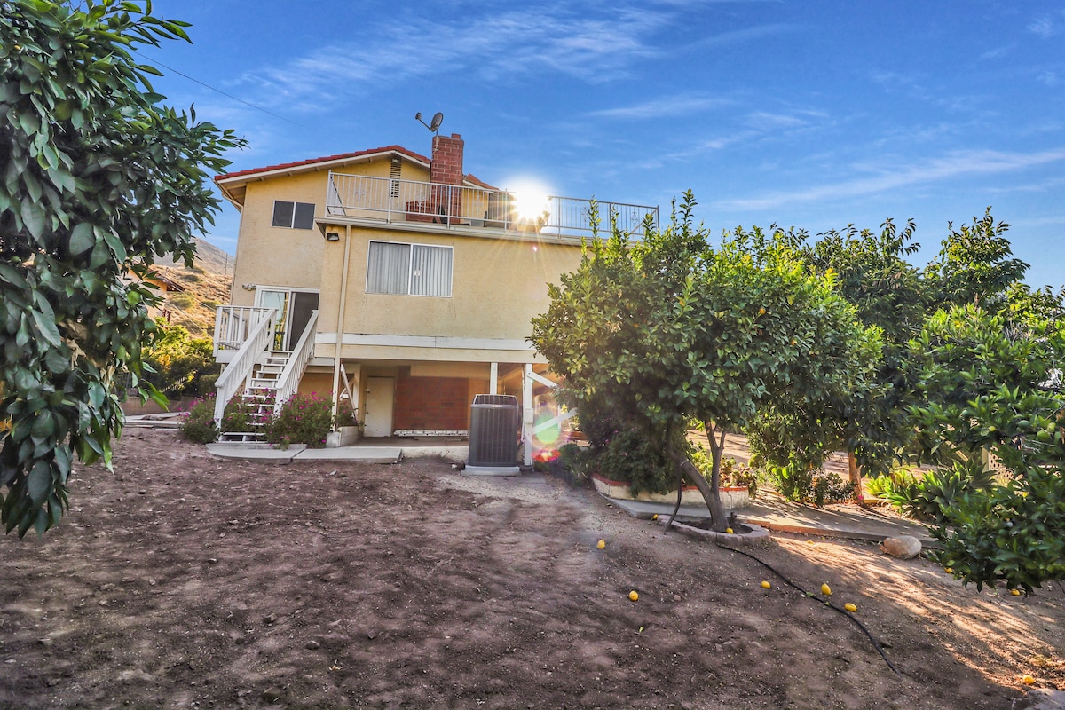 Relájate en esta escapada única y tranquila, situada en una granja orgánica de cítricos en un terreno privado de 27 acres con vistas a la montaña y al valle de los cítricos y los aguacates. Esta unidad tiene su propia entrada privada y una terraza privada con fregadero al aire libre, barbacoa y zona de comedor. El espacio habitable interior tiene aproximadamente 960 pies cuadrados y la terraza tiene aproximadamente 800 pies cuadrados. La casa funciona con energía solar y baterías Tesla, por lo que no tendremos un apagón incluso durante los cortes de energía, siempre y cuando no se utilice mucho aire acondicionado.
