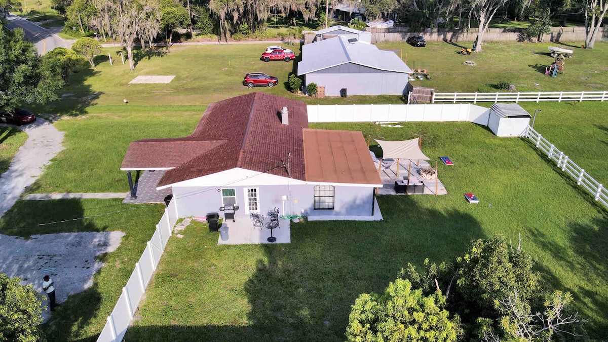 No forma parte de Paradise Lakes. ¡Llega a esta casa recién renovada y no te preocupes por el resto de los días! Disfruta del cielo estrellado por la noche mientras estás sentado alrededor de la chimenea en nuestro acogedor salón al aire libre. Esta espaciosa casa, sentada en un lote de 2 acres, se encuentra lo suficientemente lejos de la bulliciosa ciudad para tener una estancia serena y lo suficientemente cerca para un rápido viaje en coche para ver lo mejor que Tampa tiene para ofrecer. Esperamos poder ofrecerte una estancia excelente