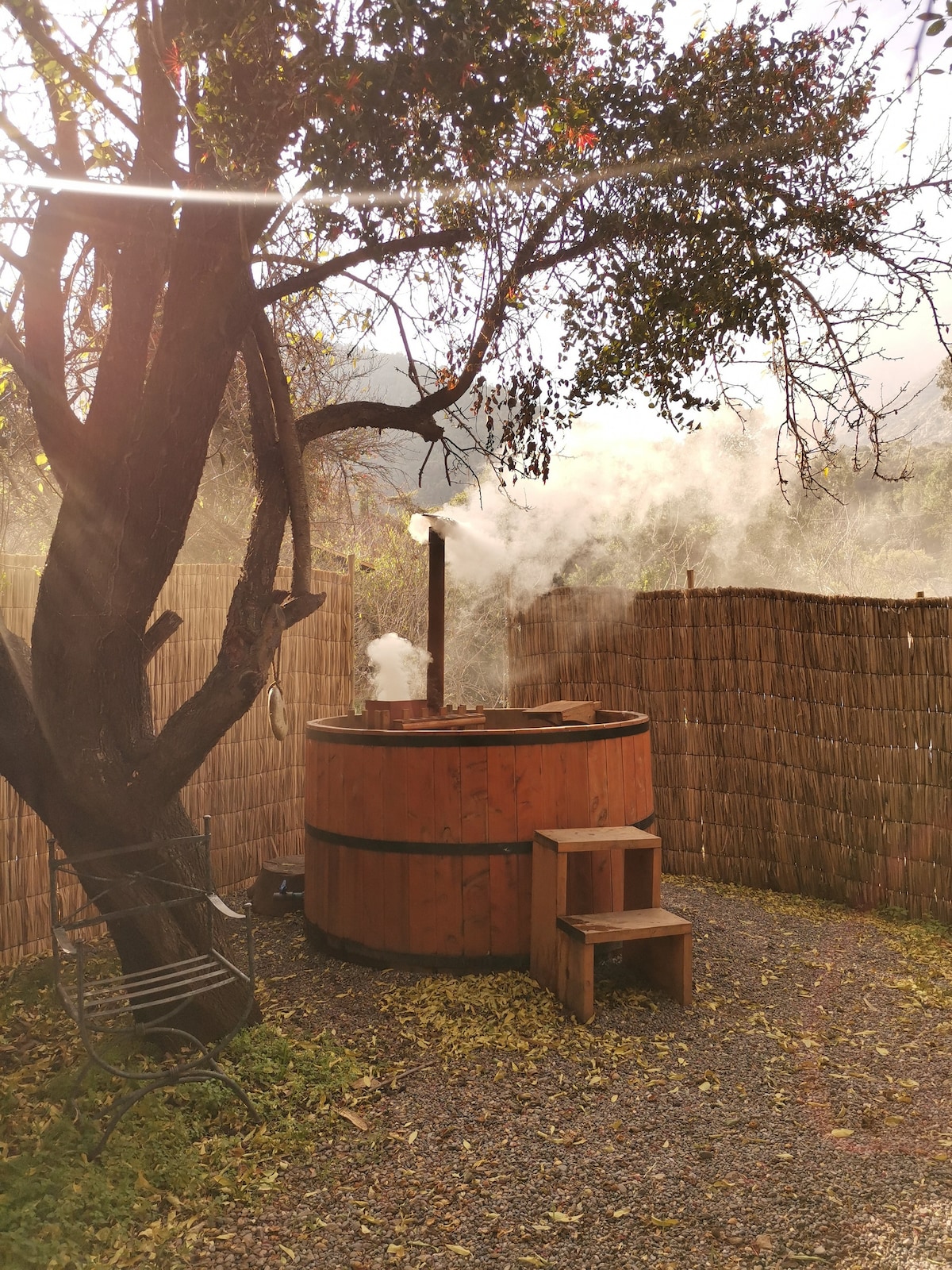 Cabaña Andes, nos encontramos cercano a Santiago en plena precordillera a 1.150 mts de altura, rodeado de bosque esclerófilo con increíble vista al valle, montañas y estrellas. Contamos con terraza techada, vertiente natural apta para el baño, piscina privada que se convierte tinaja XL con 6.000 lts de agua de vertiente a 40°C, sin horarios y con hidromasajes. La cabaña es privada y cuenta con todas las comodidades y equipamiento para disfrutar al máximo su estadía y wifi.