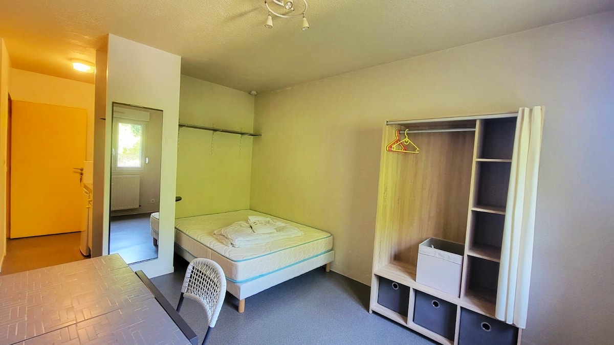 Estudio con encanto, con cama con memoria, wifi, wifi, televisión, cuarto de baño (ducha), cocina equipada, pequeño patio exterior con muebles de jardín. Barrio Tranquilo, Estacionamiento gratuito Tarifa decreciente durante una estancia larga bajo petición. Los ciclistas son bienvenidos. El terreno está cerrado y las bicicletas están seguras.