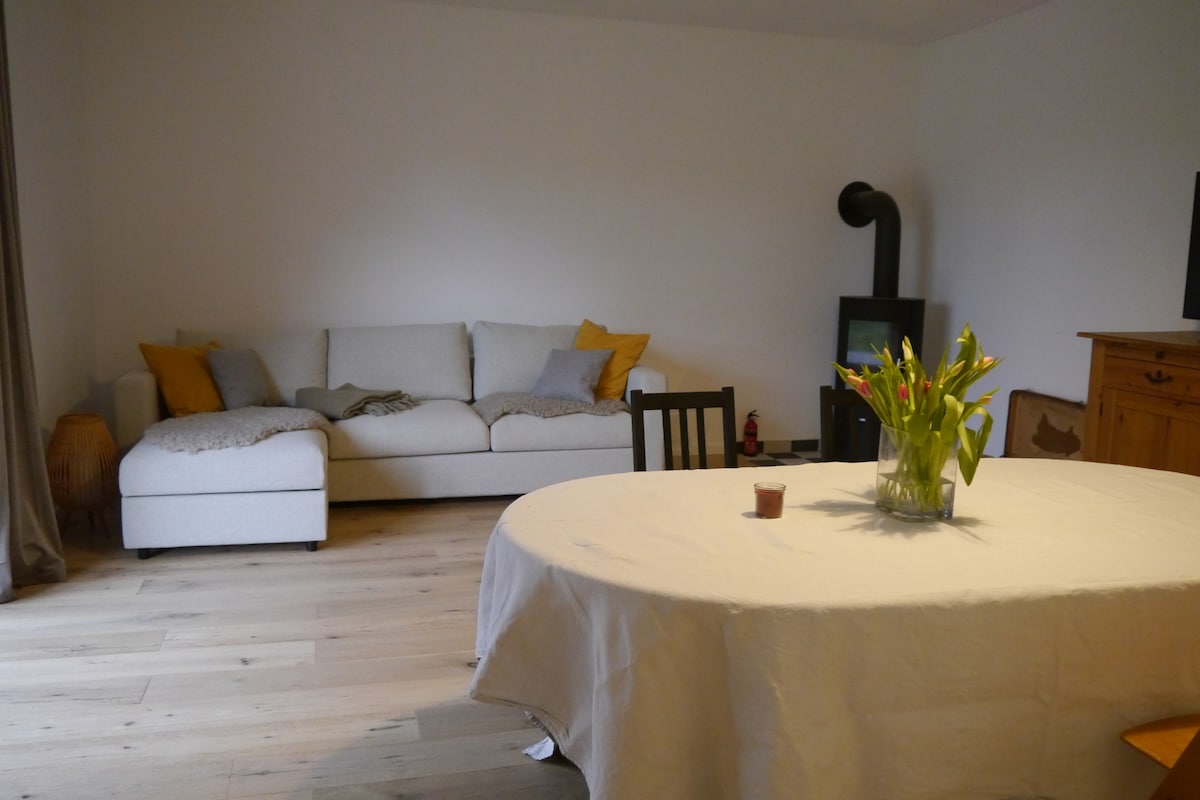 Relax in this special and quiet accommodation, picturesque village Ihlow, in the Märkische Schweiz (5km walk through the forest to Buckow), 55km east of Berlin. You can swim in the Reichenower Lake (3km) or in the Grosser Thornowsee. If you don't have a car, you can get there by bus or bicycle (18km) from Straussberg Nord station. The house was finished in 2022 (developed by 3 architects of the Berlin Academy of Art 3 bedrooms,2 baths, large dining table, fireplace, finnish sauna, sunny terrace
