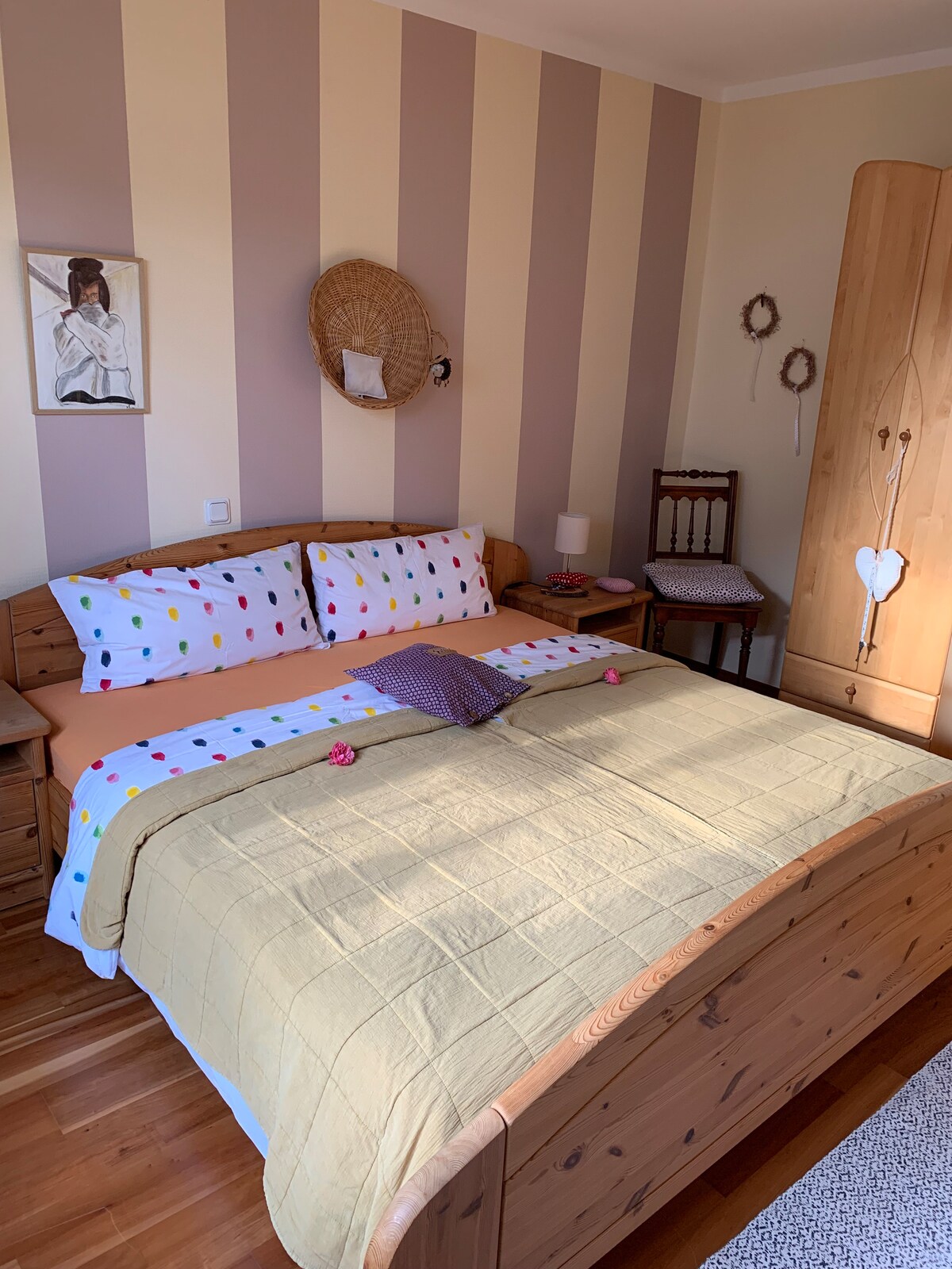 Helle, freundliche Dachgeschosswohnung. Es gibt ein Doppelbett und ein Reisebett für Kleinkinder im Schlafzimmer und eine Couch im Wohnzimmer. In der geräumigen Küche kann in gemütlicher Runde gegessen werden. Im Bad gibt es eine Badewanne mit Duschabtrennung. Die Wohnung befindet sich im Haus meiner Mama. Sie kümmert sich um die Schlüsselübergabe. Bei Buchung mit Hund fallen 5 € zusätzlich pro Tier und Nacht an. Bitte die Kurtaxe in Höhe von 2,50 € pro Person bar vor Ort bezahlen.