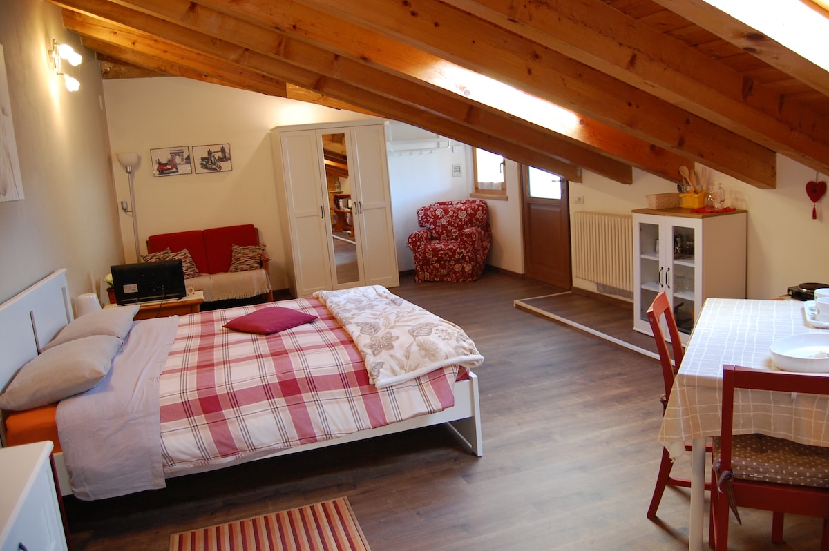 Levico Terme centro storico, PER 1 o 2 PERSONE. Open space MANSARDATO con bagno, secondo piano (poche scale ma ripide). ASSENTE LA CUCINA: forno microonde, piastra per colazione, mini-frigorifero. Solo pasti veloci ! WIFI 24 ore. Parcheggi liberi 5-10 minuti a piedi. Pochi passi dal LAGO, dalle TERME, dal PARCO ASBURGICO ! Pista ciclabile, sport acquatici, escursioni nella natura, vicino ai bellissimi MERCATINI DI NATALE. PISTE DA SCI a 15 km (Panarotta). NON ADATTO A BAMBINI da 0 a 6 anni.