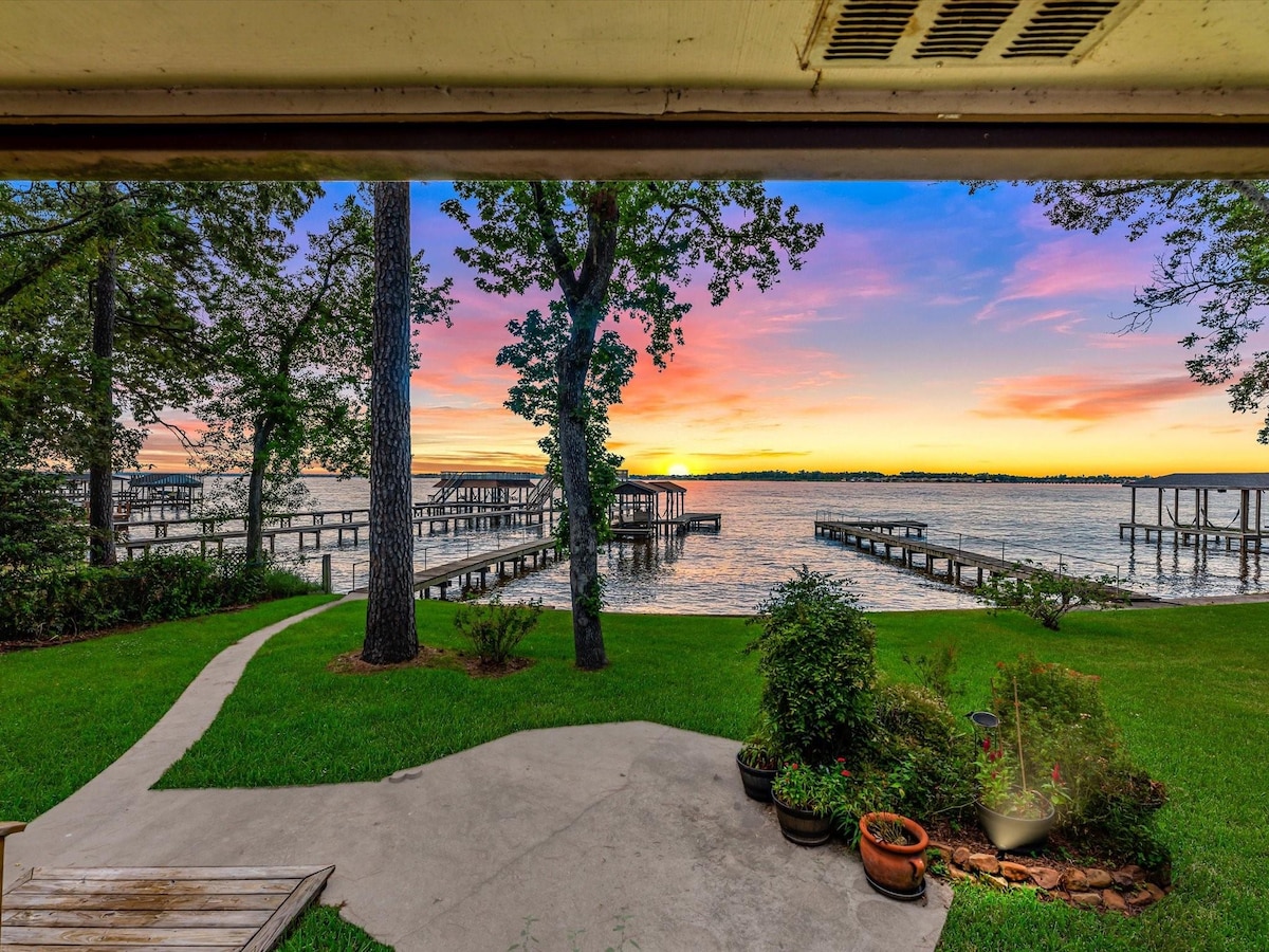 ¡Casa FRENTE AL LAGO en 3/4 de acre con vistas abiertas al agua del lago Houston! El alojamiento se encuentra cómodamente en la sección media de este espacioso lote frente al lago. Hay mucho espacio para estacionar con la entrada extendida. Una suite principal en la planta baja con acceso privado a la terraza exterior. Las principales salas de estar están diseñadas con un concepto abierto, que presentan vistas al lago desde todas las ventanas. ¡Disfruta de una gran cantidad de área cubierta por el porche trasero! ¡El muelle extendido conduce a una casa de botes y una casa separada para motos acuáticas/kayak!