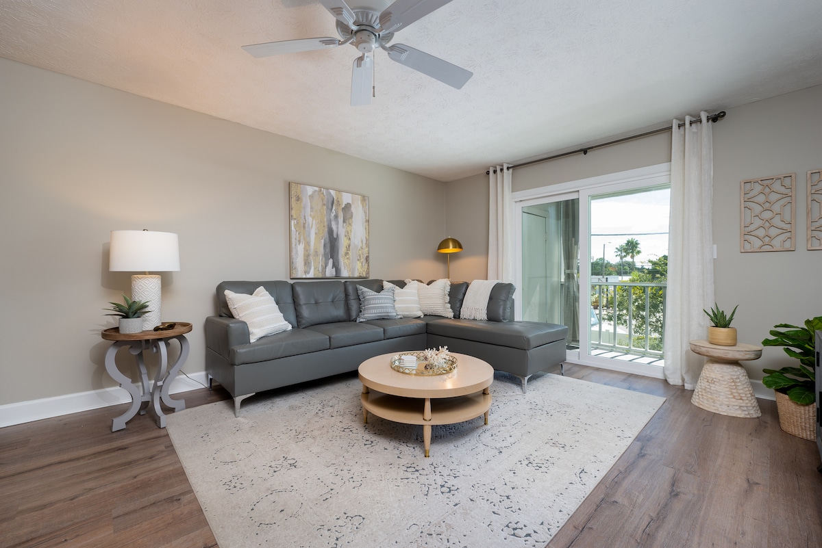 Relájate en este acogedor y cómodo departamento en la planta superior con patio. No te preocupes por la lucha por el estacionamiento en el centro de la ciudad, EL ESTACIONAMIENTO ES GRATUITO en el lugar (1 lugar designado para tu apartamento). Muchas atracciones cercanas a solo unos pasos (o un paseo en tranvía) de la puerta, incluidas las compras en St. George St, restaurantes y playas de arena donde puedes alquilar tablas de surf de remo, kayaks, pequeños veleros y más. Tenemos una cafetera de goteo, café, descafeinado, cremas y azúcar. Ofrecemos Roku TV.