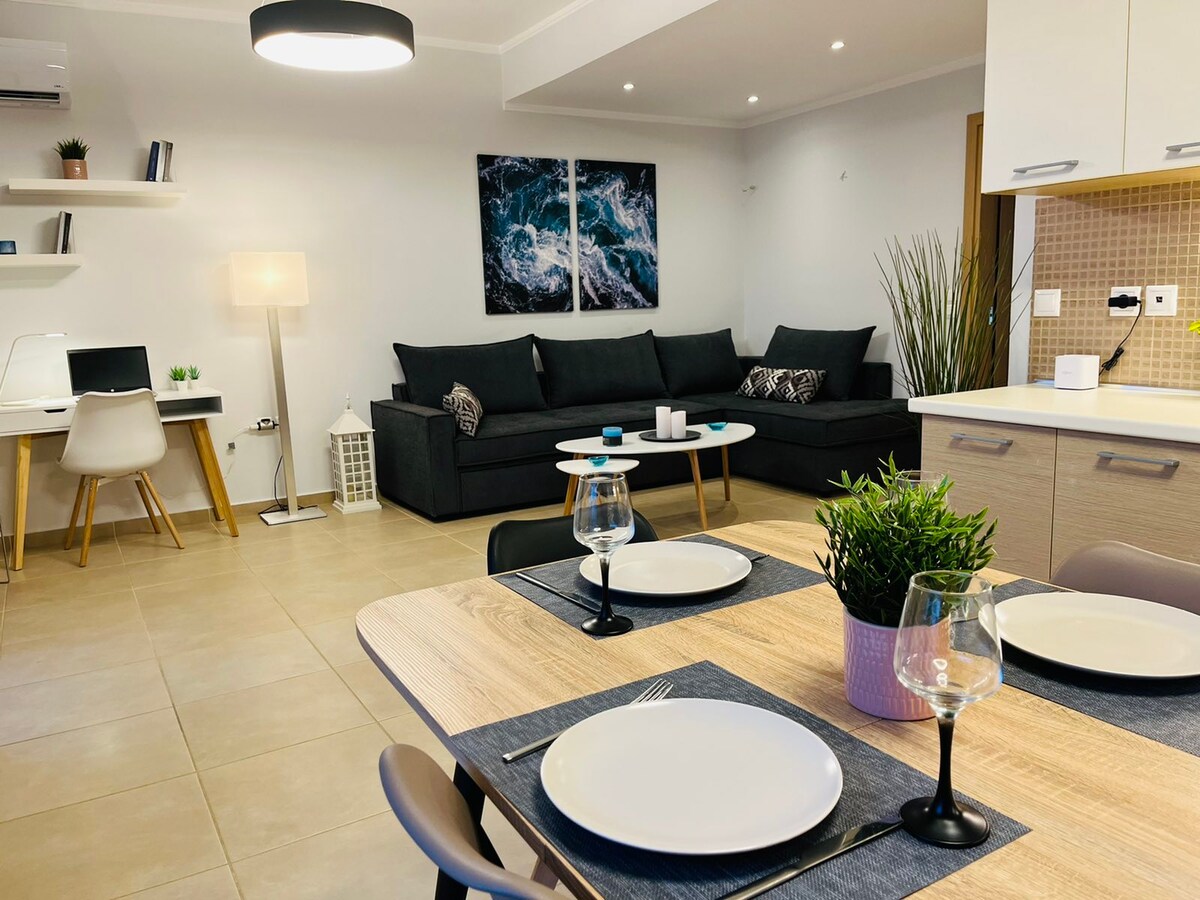 ¡A poca distancia del romántico centro antiguo de Nauplia con puestas de sol perfectas! Nuevo departamento de lujo frente al mar. Unidad de esquina en la planta baja con 2 balcones envolventes. Vista al mar con castillo de Bourtzi y vistas al jardín. Capacidad para 4 personas, con sofá cama. WIFI digital nómada 5G Otras cosas incluidas para usar son: 1. estera de yoga 2. Teclado y altavoz Roland Nafplio tiene playas increíbles, un castillo de Palamedi junto a un acantilado, excelente comida y vino, ¡y mi favorito es el sendero para caminar de 12 km!