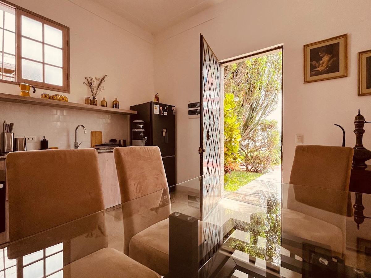 Casa única. Ubicada en el corazón turístico de Miraflores, a dos cuadras del mar, en una de las pocas quintas clásicas de la zona. Situada en un vecindario residencial pintoresco y ecléctico, goza de tranquilidad, techos altos, una pequeña terraza y mucho verde. Recientemente remodelada. Cocina equipada, 1 habitación con su baño. Cama King. La decoración de sala y comedor combina estilos clásico y moderno en espacios cómodos y acogedores.