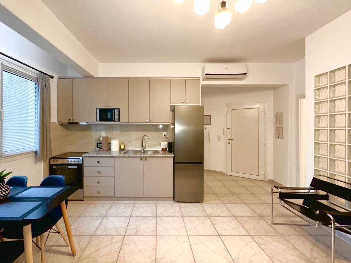 El apartamento tiene 25 metros cuadrados de tamaño y se encuentra en el corazón del centro de la ciudad de Katerini, en la calle Pezodromos (peatonal). Ofrece acceso directo (a 3 minutos a pie) a las cafeterías, los bares, restaurantes, supermercados, el estacionamiento municipal de bajo costo del estacionamiento municipal de bajo costo y la estación de autobuses local donde puedes tomar un autobús que conduce a la estación de tren y a la playa Paralia (en aprox. 15 minutos). El departamento está en el piso baja, está completamente renovado (en 2023) y equipado. Apto para el ocio y/o viajes de negocios.