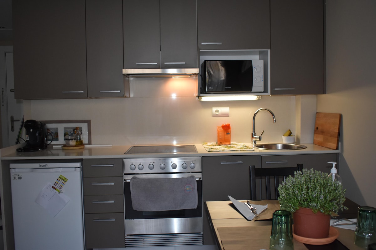 Pequeño estudio económico 20 m2 en el centro de la ciudad con las ventanas de blindaje . Playa a 5 minutos . Еstación de tren también 5 minutos de distancia. En 200 metros parking larga duracion y el aparcamiento gratuito en el lado opuesto de la autopista está a 7-10 minutos a pie. Muchas cafeterías, restaurantes y supermercados cerca . Area segura. Nuestras instalaciones incluyen: aire acondicionado , equipo de lavandería . Cocina amueblada (congelador , hervidor de agua) . TV, Wi - Fi ..