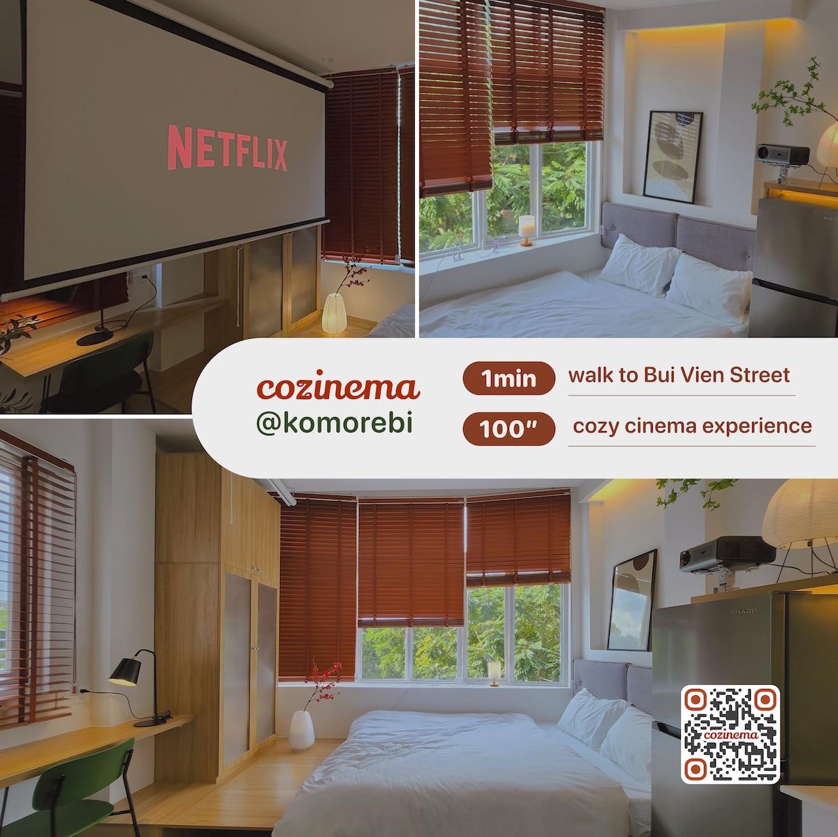 Komorebi @ Cozinema offers three unbeatable features: 1. Prime Location: Heart of HCMC, 1 min to Bui Vien Street and 5 mins to Ben Thanh Market. Surrounded by cafés, local eats, and public transports right at your doorstep. 2. Skyline & Parkfront Views: Enjoy a breezy balcony overlooking 23/9 Park, blending lush greenery with stunning city skyline lights at night - the perfect balance of calm and vibrant. 3. Cinematic Retreat: 100" 4K projector & Dolby 5.1 audio for ultimate relaxation.