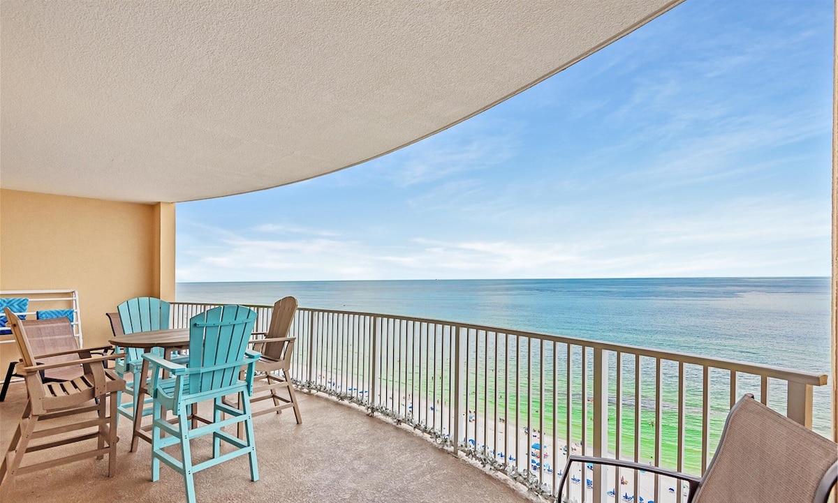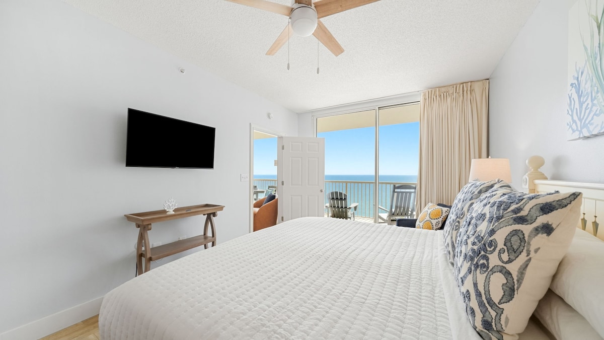 Lujoso departamento recién renovado frente a la playa en el piso 13 con 3 dormitorios/2 baños, techos altos, impresionantes vistas al mar, 2 camas tamaño king, 1 cama tamaño queen y dos camas individuales plegables, amplia sala de estar. Disfruta de una piscina climatizada, gimnasio y zona de picnic con parrilla. Puede caminar hasta Pineapple Willy’s y restaurantes cercanos; está cerca de WonderWorks, Ripley’s Believe It or Not, el parque acuático Shipwreck Island, el minigolf Coconut Creek y el muelle del condado. Edificio tranquilo, 2 ascensores. A 5 millas de Pier Park, estacionamiento de pago al otro lado de la calle.