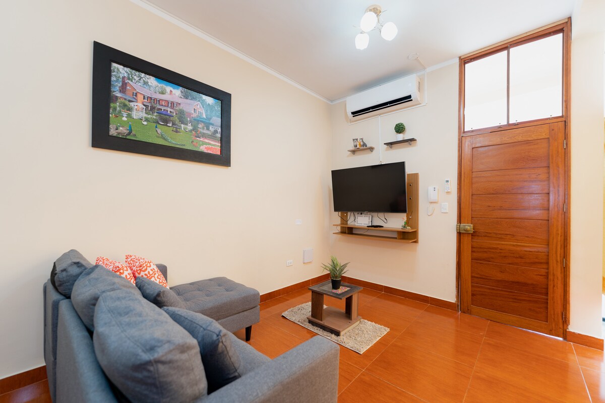 Departamento privado y exclusivo para el huésped, 1er piso, ingreso autónomo, luz natural, acogedora sala con sofá cama y Smart TV de pantalla plana; mesa con cuatro sillas, aire acondicionado; cocina moderna, un dormitorio con cama 2 plazas, incluye espacio de trabajo dedicado, baño principal; medio baño, terraza con parrilla, lavandería con lava/seca. ¡Internet de alta velocidad, estacionamiento, a 10 min. del aeropuerto y 6 min. de la plaza de Tpp. Disfruta una experiencia inolvidable.