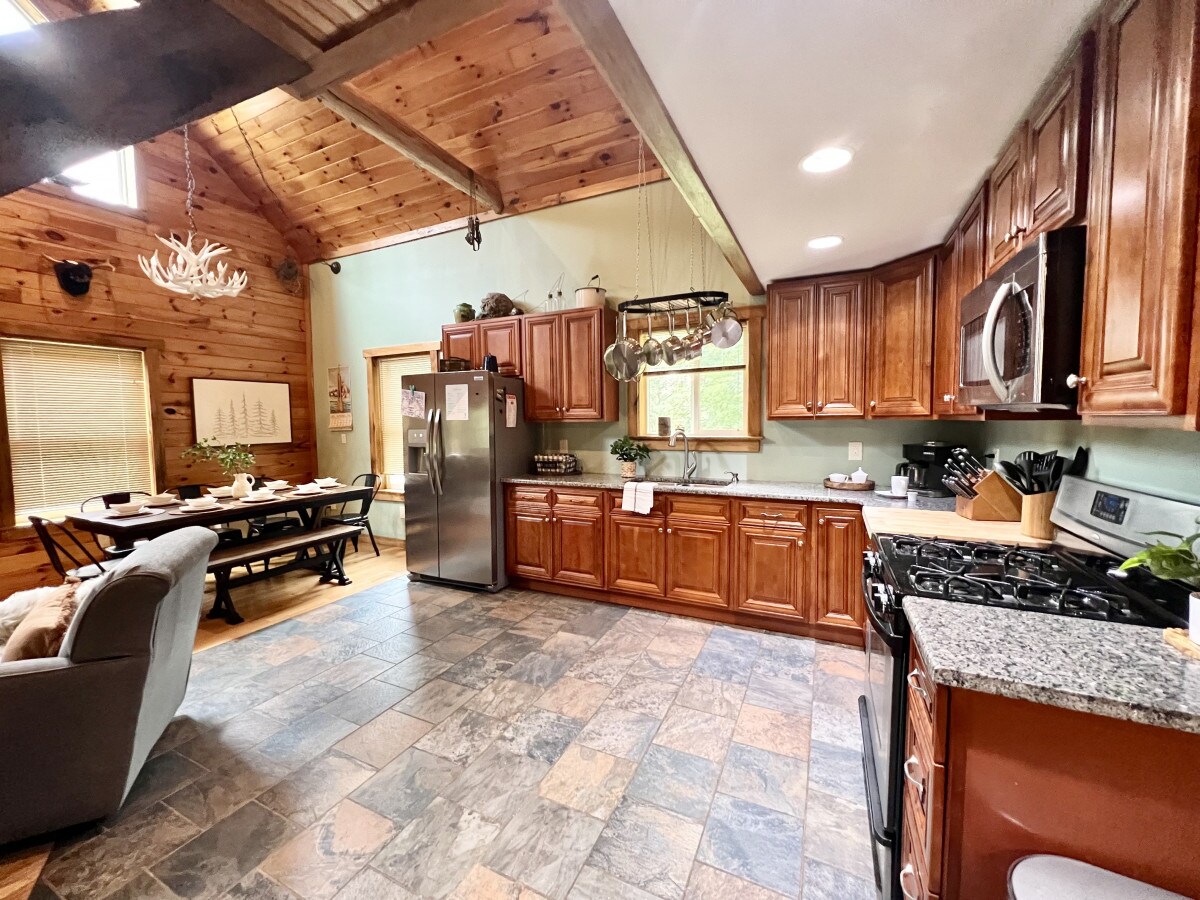 Bienvenido a la cabaña Hideaway, donde podrás relajarte en el abrazo de la naturaleza. Aquí, puedes asar tus platos favoritos en la parrilla, descansar en las sillas Adirondack en el balcón o simplemente relajarte en el interior. Por la noche, reúnete junto al fuego en el porche para ver bailar a las luciérnagas o relájate en el jacuzzi en el porche trasero. Es la mezcla ideal de serenidad natural y comodidad hogareña. En invierno, acércate a la estufa de leña en la sala de estar y ponte al día con tus programas de televisión favoritos.
