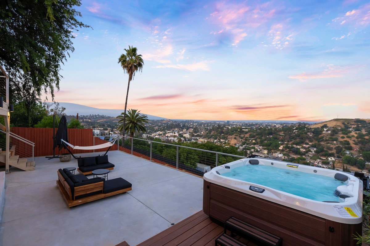 Retiro sereno, ubicado en Hollywood Hills; zen espiritual, oasis privado. Sensual y fresco con una influencia asiática/balinesa moderna, perfecta para el entretenimiento interior/exterior. Todos los baños ofrecen paz y relajación. Amplio dormitorio principal con chimenea y baño privado, bañera de inmersión y ducha de efecto lluvia. Relájate en el spa climatizado al aire libre. Este alojamiento evoca una respuesta emocional. Además, admitimos mascotas. Nuestro alojamiento solo tiene capacidad para 8 personas, no se permiten huéspedes o visitantes adicionales.
