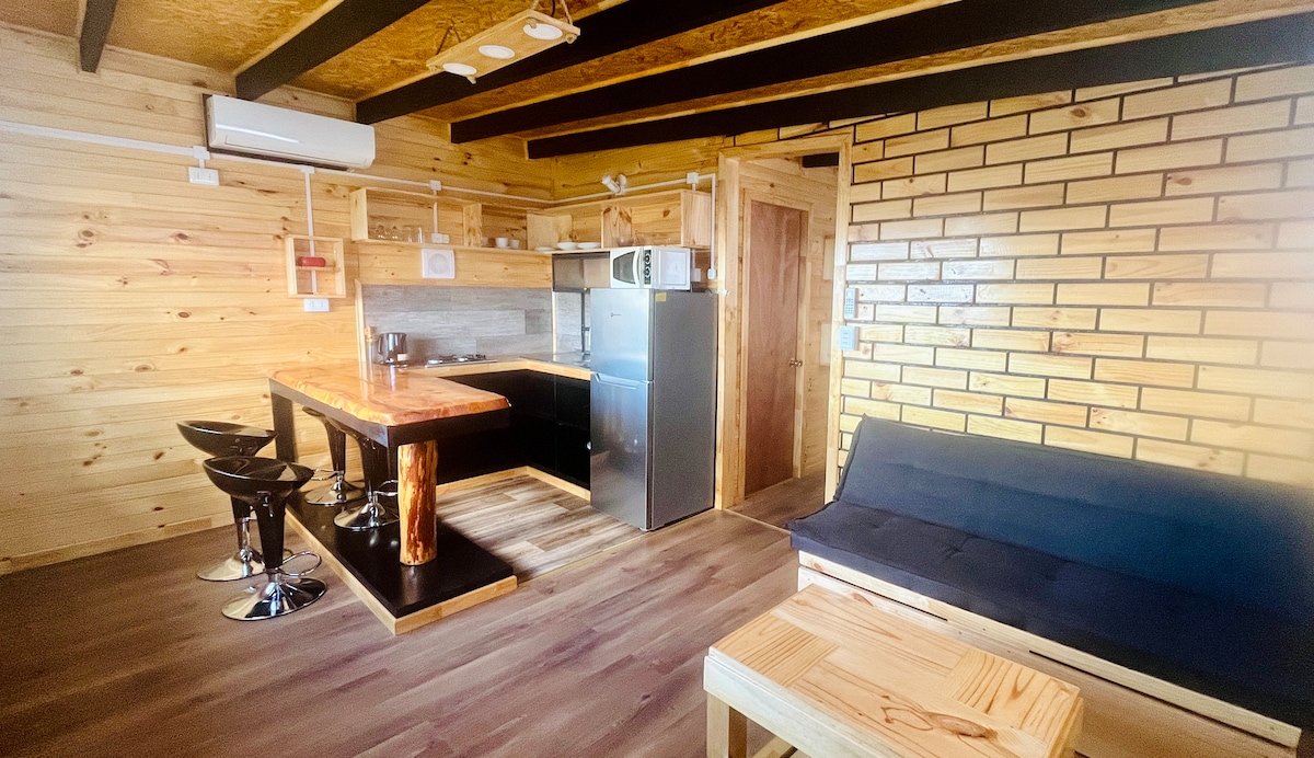 Disfruta de la calidez y entorno campestre de esta cabaña estilo loft para 5 personas, que cuenta en su interior con pequeños detalles constructivos rústicos de reutilización de maderas y decoración con imágenes representativas de la fauna de la zona. Ubicada en la localidad de Puerto Nuevo en la Región de Los Ríos, se encuentra a pocos minutos de los poblados, puntos de turismo aventura y balnearios más importantes de la cuenca del Lago Ranco.