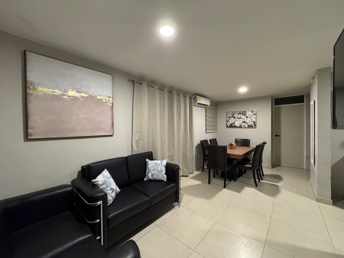 Hermoso departamento de ambiente familiar con estilo moderno y acogedor! excelente opción para descansar y disfrutar. Equipado al 100%, ropa de cama, almohadas y colchones de alta gama para ofrecer el máximo confort y descanso. Cuenta con cocina completa, estufa, horno, refrigerador, microondas, licuadora. Excelente ubicación frente a zona industrial y estudiantil. Cerca de importantes centros comerciales, a 20 min del aeropuerto, a 8 km de Parque Fundidora, Cintermex y zona centro de Monterrey.