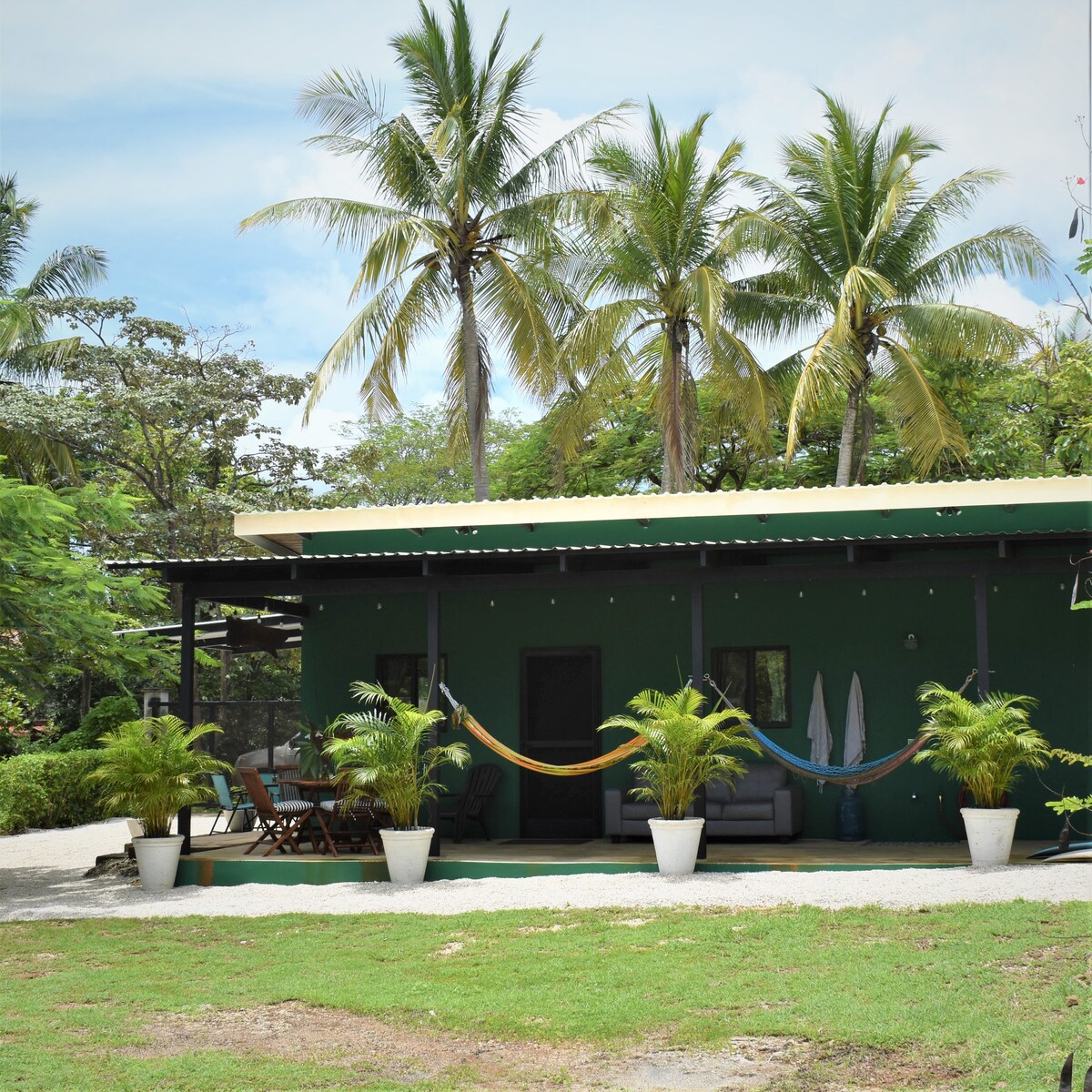 Beautiful 3 bedroom guest house within a gated development of Hacienda Pinilla and located in the exclusive beachfront private community of Avellanas,just steps from Avellanas beach.Quiet,calm and only 15 minutes from Tamarindo beach town. Plumeria Guest house is a two level,three bedroom home with full A/C uniquely designed to feel submerged in nature while being only 60 feet from the beach and close distance to surf breaks, Lola’s and Beachclub