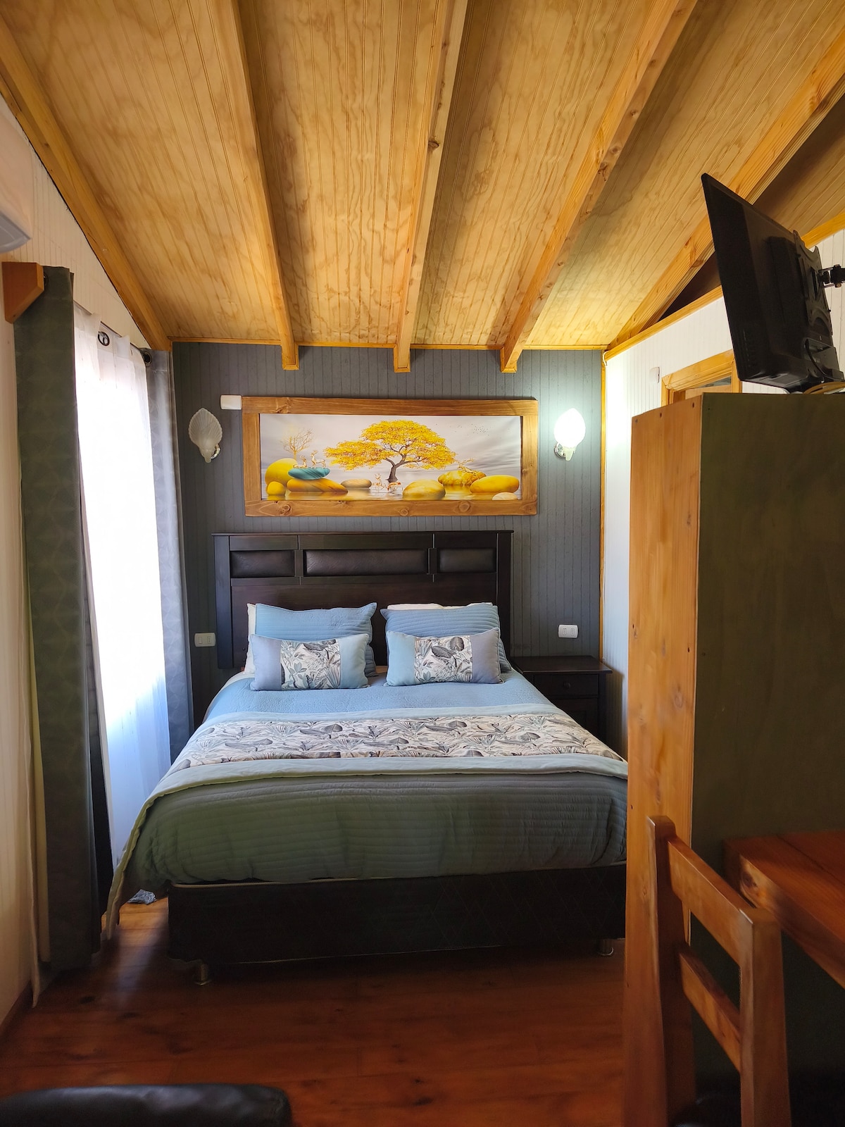 Cabaña Araucaria especial para parejas. Esta ubicada cerca de Terminal de Buses, supermercados, centro de Valdivia, costanera. Lugar muy céntrico Cabaña tipo loft Cocina, pequeño living, y cama matrimonial, con todo lo necesario para una grata estadía Mencionar que la ducha es con agua caliente (Calefon ionizado) Por favor, avisar si vienen en vehículo