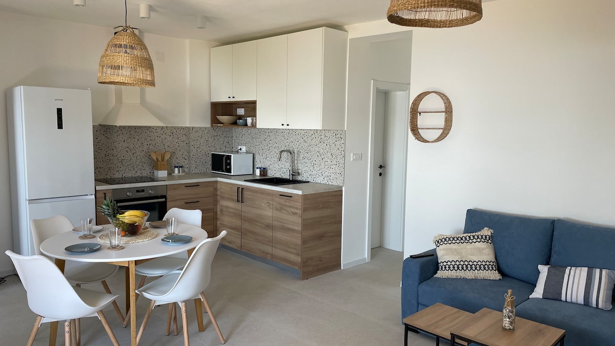 Nuestro apartamento de 4 estrellas está a solo 15 metros de la playa del hotel y está completamente amueblado, tiene aire acondicionado, wifi y estacionamiento privado y es adecuado para 4 personas. Tiene una terraza con impresionantes vistas al mar. Todas las habitaciones dan al mar.
