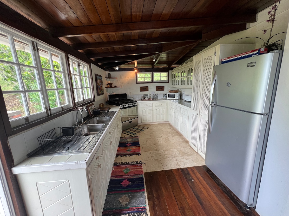 Pine house on rainforest edge Queen Bed Superior mattress Mosquito net Outstanding views valley/sea/gardens WIFI Comfortable, rustic, clean Tranquil setting Can be very windy Good for hikers, birders, yogis Daybed Hike: can hear parrots from cottage Vermont Trail Hills above Bush Bar 10mins-1hr Table Rock, Moonmarket 1 hr 3️⃣ Ponds Waterfalls 2hrs Drive: Superb snorkelling site 45 mins. Provided: Soap, handmade with coconut oil and no fragrance Salt, pepper Coffee 1 towel each Cafetiere