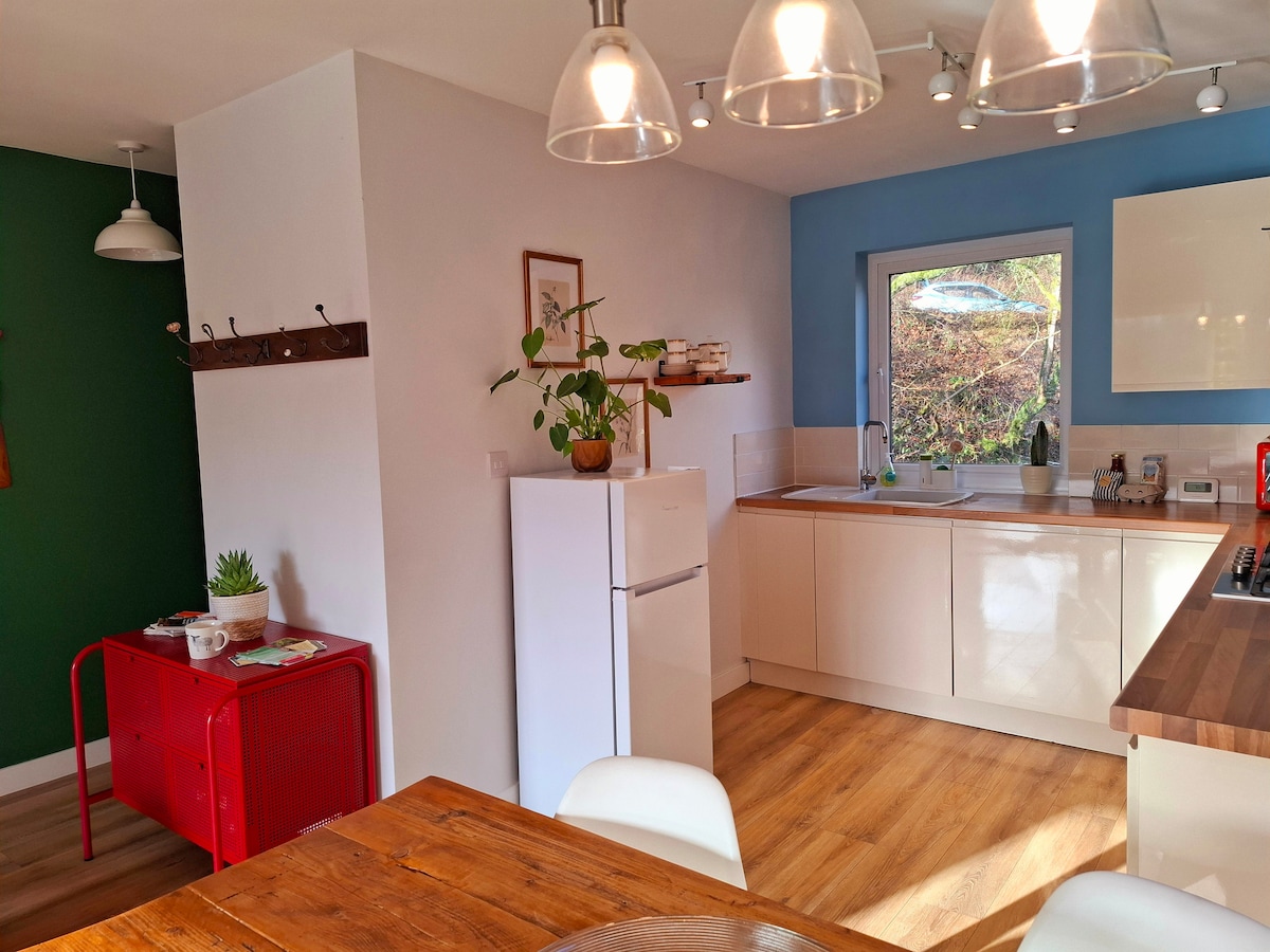 Un espacio tranquilo y profundamente lujoso para recargar energías y reconectar. The Shippon es un establo de vacas meticulosamente convertido con suelos de hormigón pulido y radiante, paredes de color verde oscuro suavemente curvadas, cocina hecha a mano, rincones de lectura cálidamente iluminados y materiales naturales. Mantas de lana, sofá de plumas, estufa de leña escandinava antigua, cama tamaño king con sábanas y edredón franceses, ducha de cascada y las toallas más suaves. Nuestra tranquila aldea de Devon solo está iluminada por las estrellas por la noche. Es posible que duermas mejor de lo que has dormido en años.