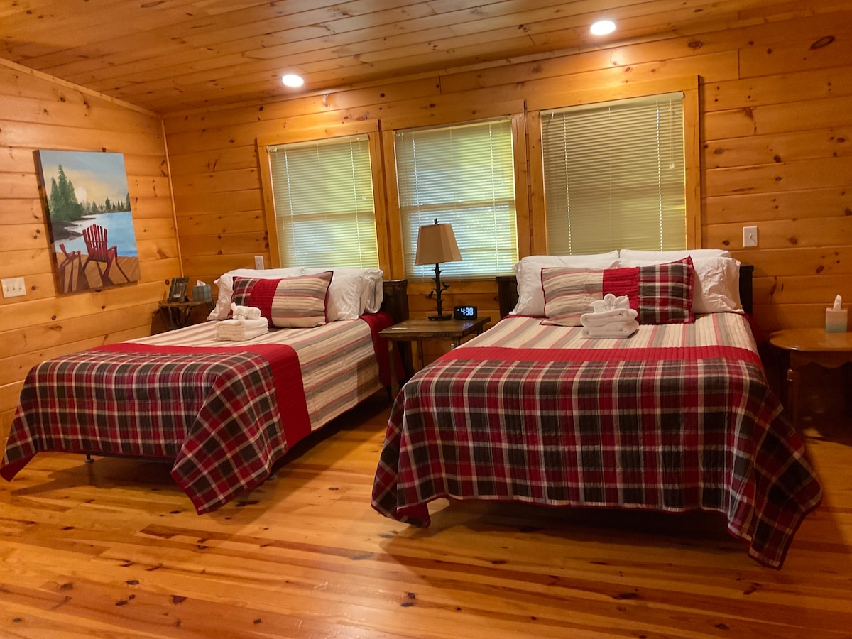 Cabin home made for connecting with friends & family, nestled at the end of a quiet gravel road. Ample space to dine, entertain & sleep a big family, with 4 bedrooms, 3.5 bathrooms, and 3 sleeper sofas - but comfortable for a couple as well. Main living area includes a very large TV with satellite and a wood-burning fireplace (& breathtaking views). Large gameroom with billiards, darts, boardgames, arcade game (free play), foozeball, & ping pong. Pool and hot tub out back may be open all year!