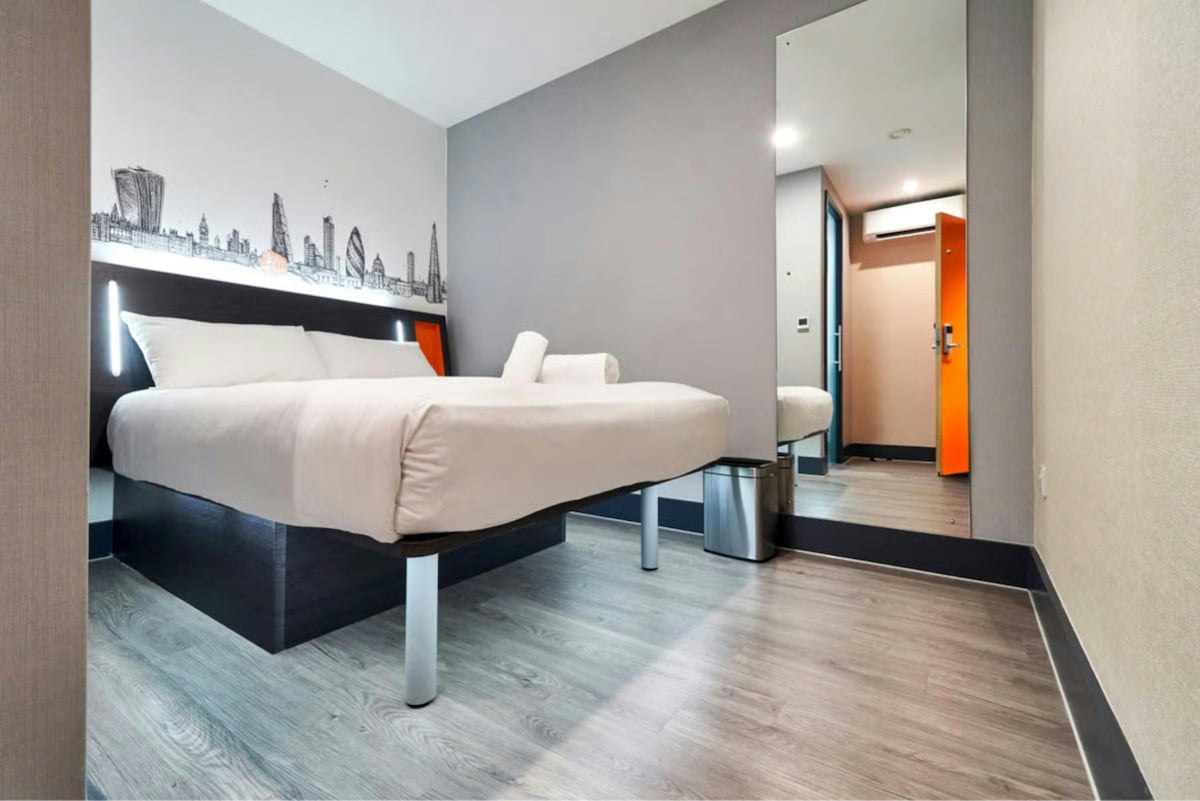 El Grande Studio en Roomzzz Stratford ofrece un espacio espacioso y cuidadosamente diseñado, perfecto para estancias prolongadas o mayor comodidad. Con una superficie de aproximadamente 31 metros cuadrados, cuenta con una lujosa cama tamaño king, un elegante baño privado, una zona de cocina totalmente equipada y un espacio de trabajo. El diseño moderno combina estilo y practicidad, lo que garantiza una experiencia relajante y lujosa.