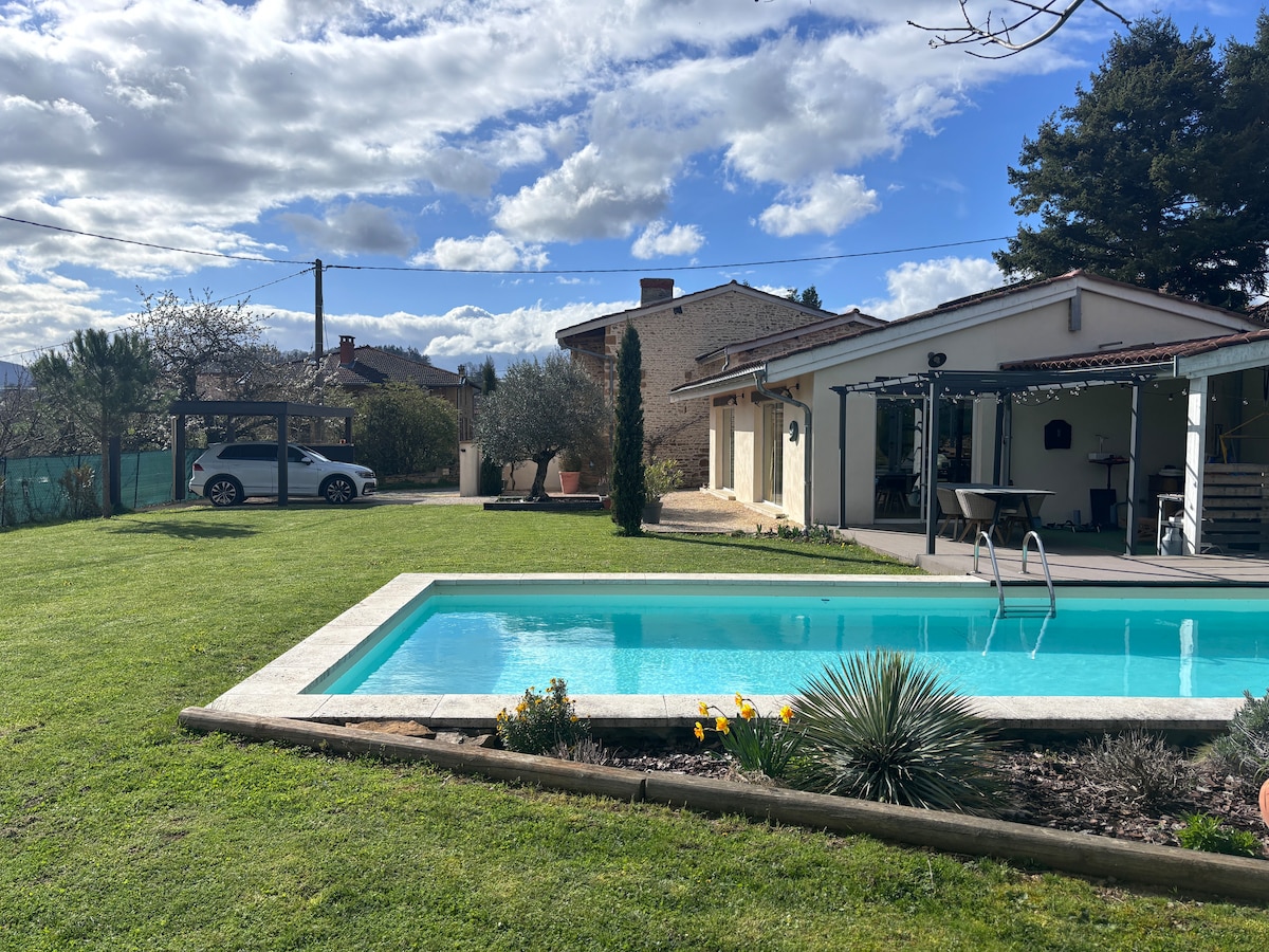 Profitez d'une propriété raffinée et confortable à seulement 35 minutes de Lyon. La maison comprend une cuisine dinatoire avec cellier, un salon donnant sur la terrasse. Au 1er étage, une chambre double, une chambre avec 2 lits simples et une salle de bain. Du hall on accède à une pièce avec sauna, tapis de sport, douche et toilette. Au 2e étage trois chambres doubles, une salle de bain, toilettes. A l'extérieur, grand jardin, piscine chauffée, cuisine extérieure, barbecue, brasero.