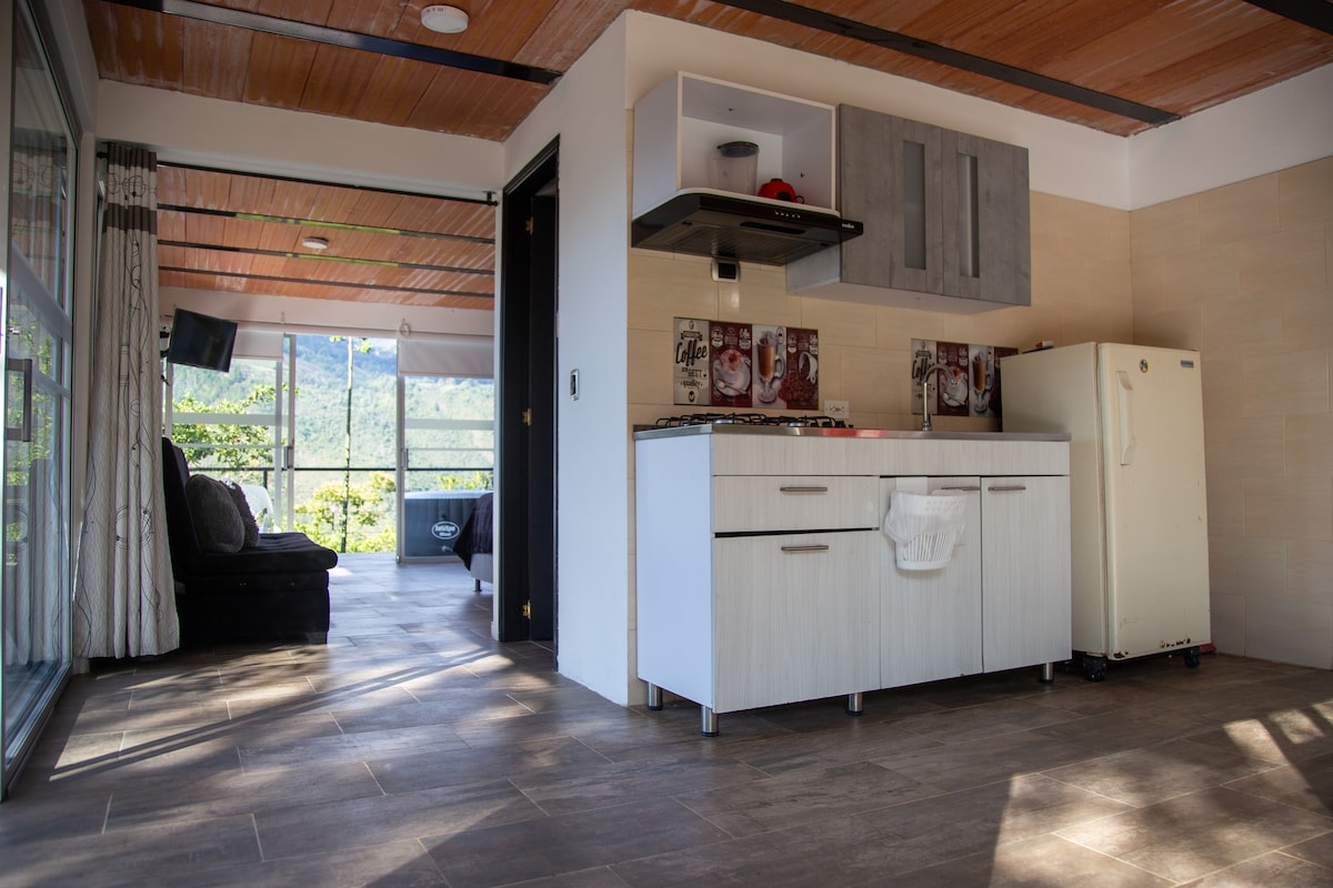 🏡 Tu Refugio La cabaña combina naturaleza y comodidad: 🛏 Cama doble con cobijas térmicas perfectas para el clima de montaña 👶 Opción de cuna para bebé (bajo solicitud) 🚿 Baño privado con ducha de agua caliente 🧺 Toallas incluidas ☕ Minibar y cafetera 💧 Agua filtrada para consumo 🍳 Cocina para almacenar y preparar tus alimentos 🌿 Mesa exterior parasol 🌂 Sombrilla en caso de lluvia 🔥 Círculo de fuego privado Todo está pensado para tu cómodidad sin perder la conexión con la natural.