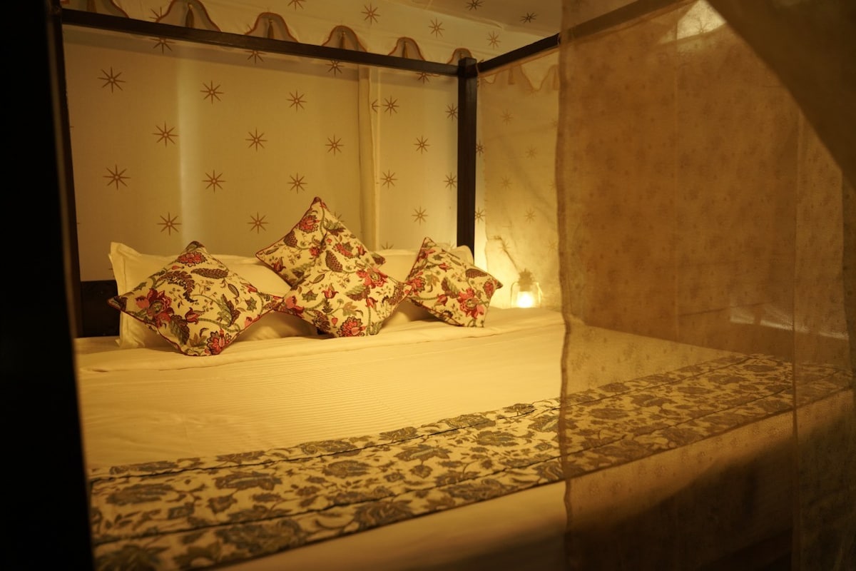 Experience a luxurious jungle stay in the heart of Ranthambore, where heritage elegance meets modern comfort. This spacious luxury tented cottage is thoughtfully designed with a royal touch, featuring a handcrafted four-poster wooden bed, premium linens, and warm ambient lighting that creates a cozy yet regal atmosphere.