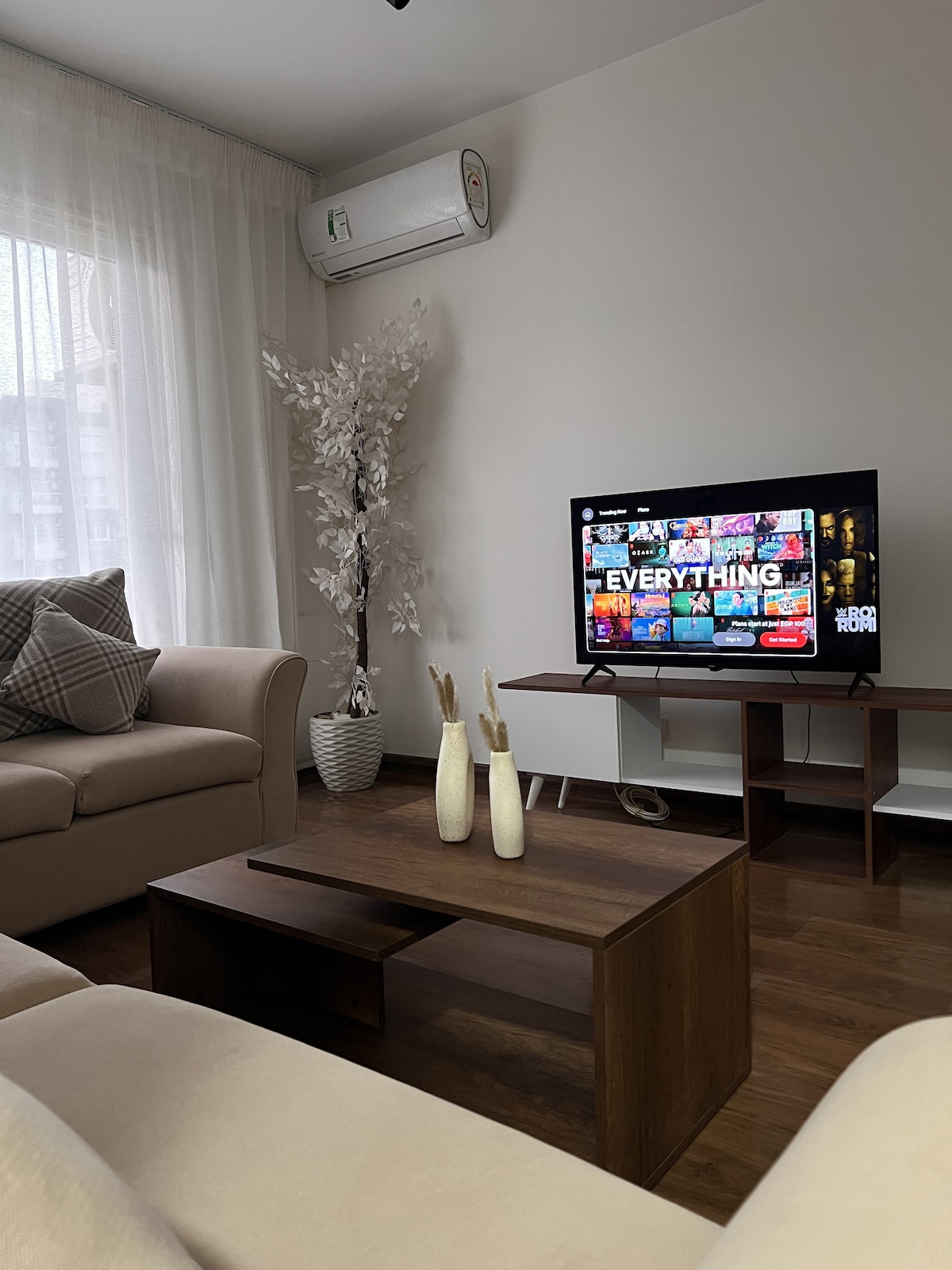 An ENTIRE APARTMENT with a back garden situated in a beautiful and green area in a peacefully integrated community fulfilling all residents' needs. Rooms are newly furnished, air conditioned, smart T.V. and all amenities you might need, super CLEAN and QUIET. The apartment is 25 minutes from Cairo intInternational Airport. coffee shops, restaurants, supermarkets, and pharmacies are all nearby. Hotel standard quality with home like comfort offered with a REASONABLE PRICED.
