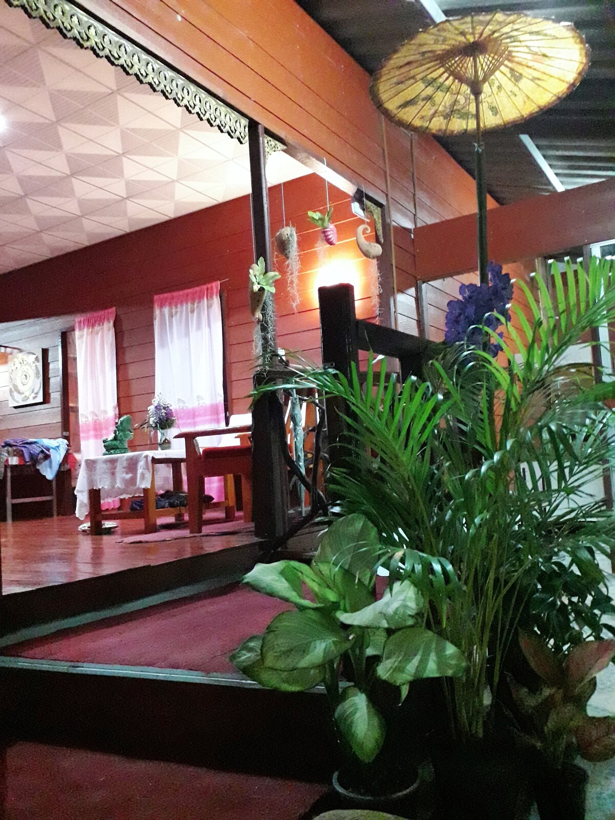 Disfruta de la vida en la campiña de Chiangmai y de la auténtica Lanna Thai Teakwooden House. La casa con dos dormitorios y una enorme terraza y balcón. La propiedad está a 30 minutos en coche del centro de Chiangmai, rodeada de un jardín de árboles longan. Los huéspedes pueden disfrutar de los sabores de la cocina tailandesa, preparada con ingredientes locales, servida en un comedor al aire libre Con su encanto rústico, su cálida hospitalidad y su rica cocina cultural, Homestay ofrece un auténtico refugio del norte de Tailandia.