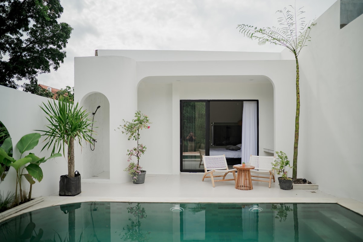 Una villa con piscina privada y diseño de entrepiso, con un área para dormir en la planta superior y una amplia sala de estar con mini despensa en la planta baja. Tiene capacidad para 4 personas, con una opción de cama supletoria disponible. Hay una puerta de conexión disponible para la villa de al lado del mismo tipo. Situado en una zona tranquila pero estratégica, cerca de las populares atracciones y lugares culinarios de Yogyakarta.
