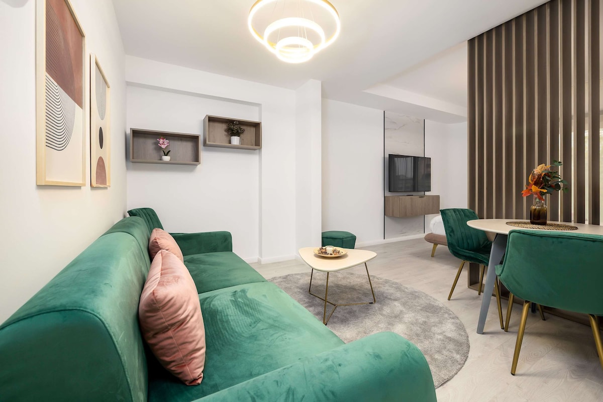 Bienvenido a nuestro luminoso y moderno estudio ubicado en la calle Nicolae Galea en Bucarest, con detalles frescos en verde y blanco y grandes ventanales que inundan el espacio de luz natural. Perfecto para una estancia urbana acogedora con un toque de encanto inspirado en la naturaleza. Ideal para una estancia relajante en un barrio bien comunicado. :)