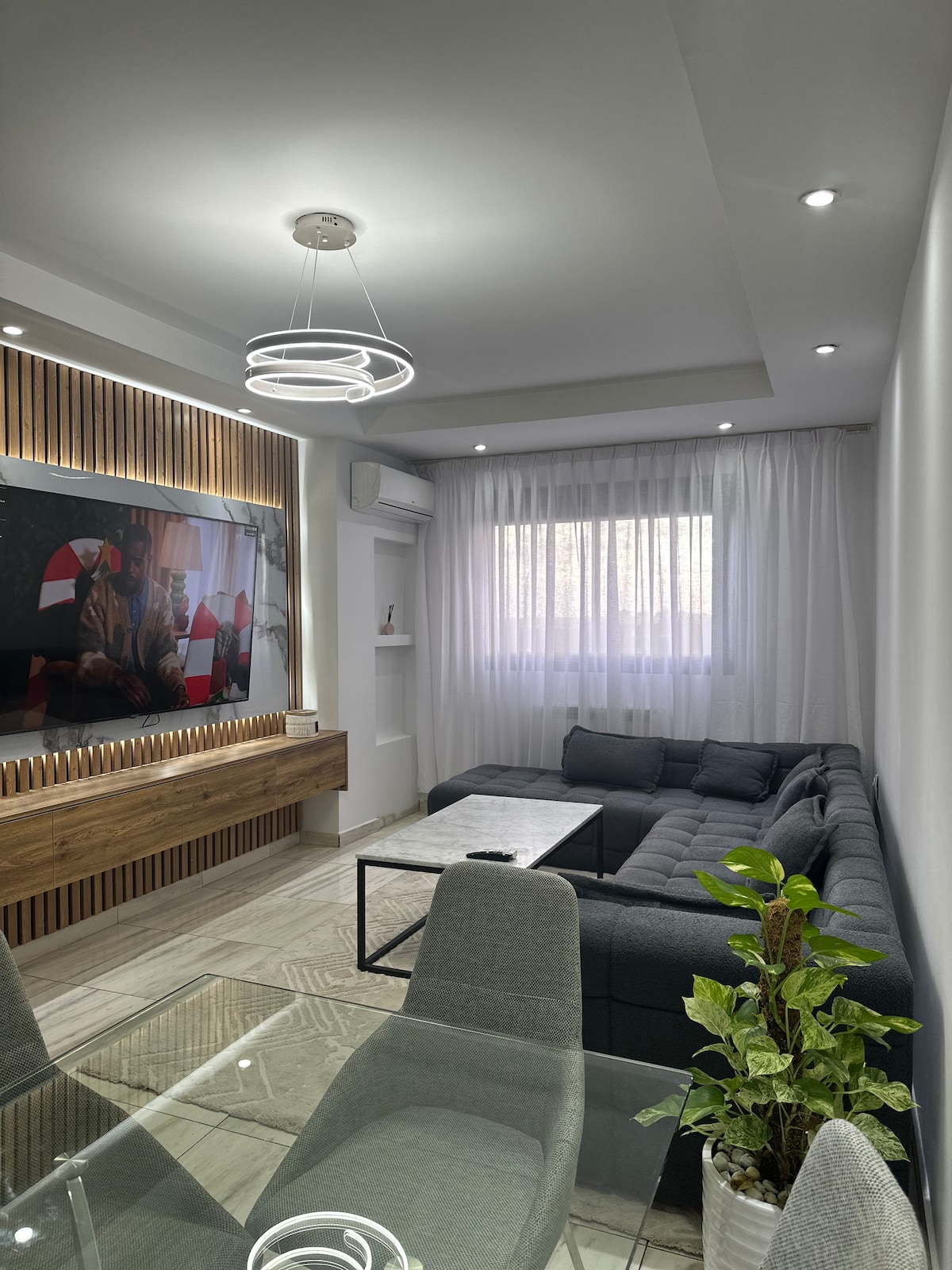 Lujoso apartamento de 2 habitaciones de alto standing con aire acondicionado en una urbanización con seguridad. Apartamento nuevo con todas las comodidades. Espacio de aparcamiento privado con ascensor, parque y jardín. Cerca de la playa y transporte público a 15 minutos del Sheraton y a 2 pasos del centro de la ciudad. Cocina totalmente equipada (horno, microondas, cocina, lavavajillas, lavadora y electrodomésticos...) Cuarto de baño con ducha, suelo radiante y mini «hammam». Una acogedora habitación con cama doble, TV y luces relajantes.