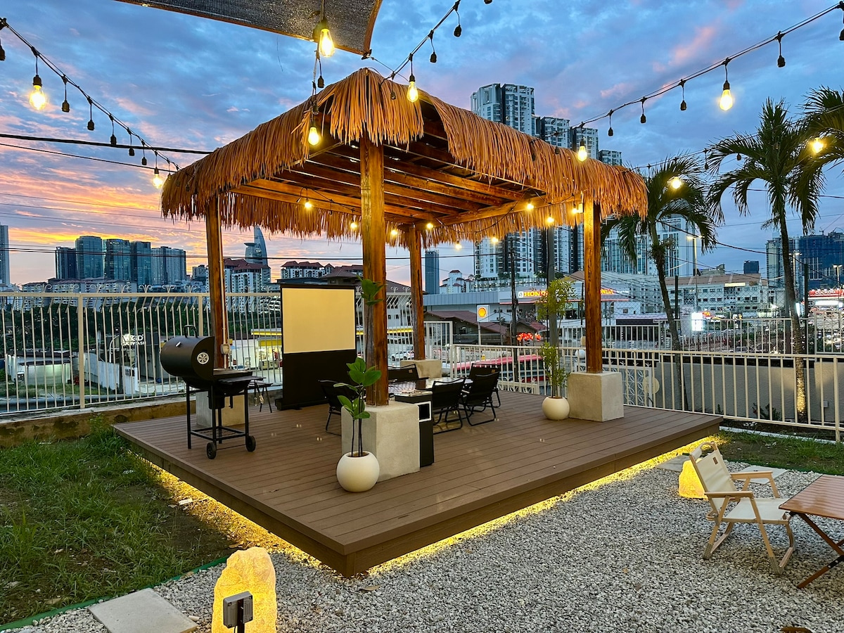 ¡Casa de vacaciones de estilo Nyonya recientemente renovada, ubicada en la calle más concurrida de Penang, Gurney Drive! Perfecto para una gran familia o grupo de amigos y viajeros que se reúnen para una ocasión especial. Esta estadía combina estilo moderno y comodidades para que los huéspedes se sientan como en casa. Maximizar el espacio y la luz natural con una sala de estar, comedor, cocina de planta abierta y un patio privado para barbacoa. ¡Disfruta de la máxima comodidad y relajación en esta ubicación privilegiada!
