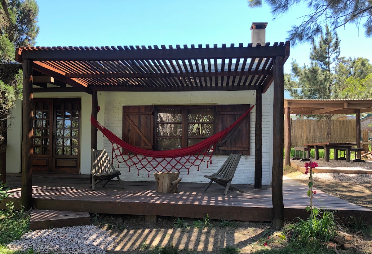 La casa esta ubicada a 7 km de la segunda entrada de Villa Serrana (Ruta 8 km 145). Es un terreno de 1000 mts2 que cuenta con una bóveda de árboles nativos, los cuales proveen sombra y un buen lugar para descansar. Si te gusta leer, tocar la guitarra o simplemente disfrutar de la paz de la naturaleza este espacio es ideal. La casa esta equipada con lo necesario para la estadía de DOS PERSONAS.