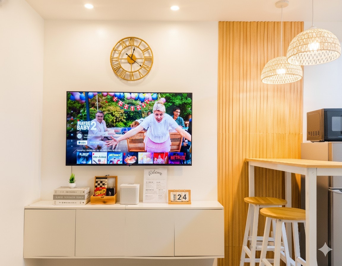 Escápate a una suite de piso alto con impresionantes vistas al horizonte de BGC, sonido envolvente cinematográfico JBL y un televisor inteligente 4K completo de 55 pulgadas con iluminación ambiental LED: tu mejor refugio nocturno de cine. Disfruta del paisaje con binoculares de alta calidad y luego sumérgete en la cama Cloud-Bed Emma® para una noche de sueño perfecto. Lejos del ruido de la ciudad, pero cerca de todo, ¡disfruta de WiFi rápido, Netflix, Disney+ y más! ¡Verdaderamente un espacio totalmente equipado para una experiencia de escapada perfecta e inolvidable con Cinema 27!